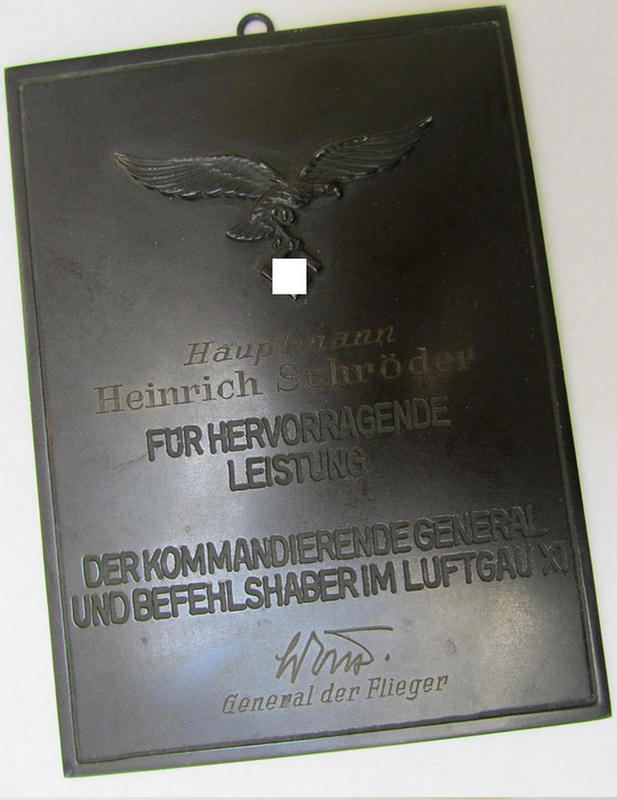 This is a nice and not so often encountered LW award: a scarce WH (LW) so-called: 'Ehrenschild für hervorragende Leistung im Luftgau XI' (honor plaque for outstanding achievements in air-district numbered 11), attributed to a certain: 'Hauptmann Heinrich Schröder', in overall very nice condition. The piece - which is actually an award and was accordingly awarded with a document and properly entered in the SB or WP - is in gorgeous condition: it is very pronounced and detailed and was never cleaned nor polished. The placque - which is sized: 15,3 x 11,3 cms. - is executed in 'bronzed' metal (I deem it real bronze because the piece is not magnetic) having a seperately attached LW eagle. The placque - which has a small ring attached in order to hang it on the wall - is wonderfully engraved and bears the engraved signature of the 'General der Flieger Ludwig Wolf', who was the commander of this 11th 'Luftgau'. Simply a nice and unsual 'Luftwaffe' related award!