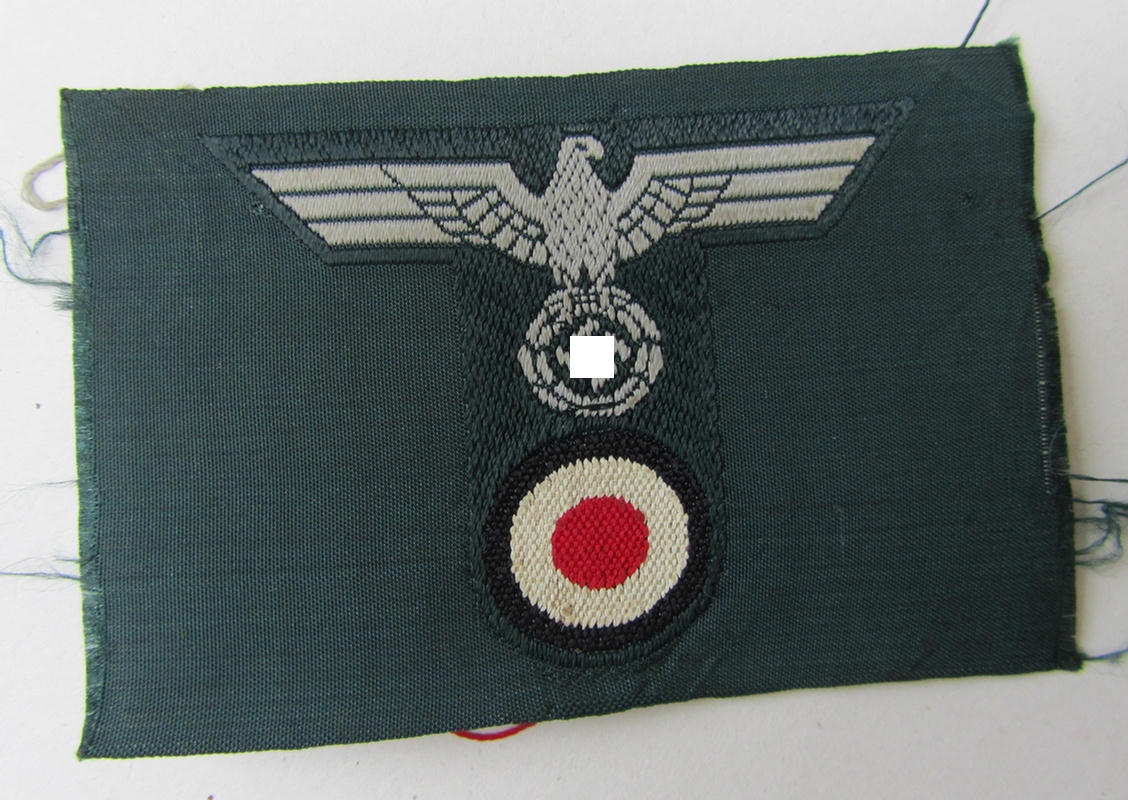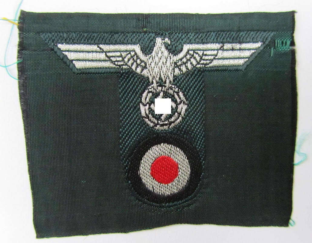 This is a mint ie. unissued example of the WH (Heer) so-called: 'T-shaped' M42-model, cap eagle/cocarde, executed in so-called BeVo weave style. The eagle/cocarde is executed in white on a dark-green linnen background and is in (stone) mint ie. unissued condition. (These cap-eagles were specifically produced for the impopular M-42 cap, but were used also on the M43 caps and predecessor models). This example is IMO almost certainly produced to be used on an (early-war) 'typical' mountain-troops ('Gebirgsjäger') M41-model cap. A very nice & rare cap-eagle: only the second such piece I ever had on offer!