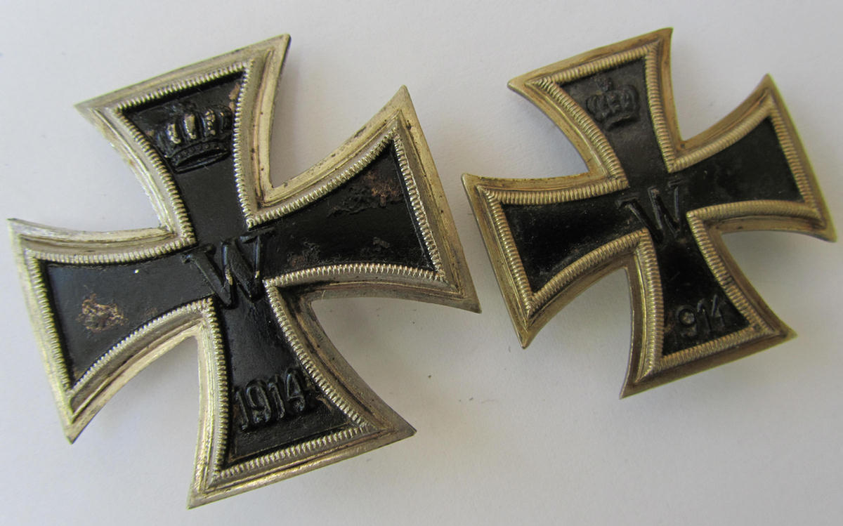 This is a truly rare set comprising of a 'regular'-sized and (rare!) miniature- ie. 'Schinkel'-sized WWI-type: 'Eisernes Kreuz 1. Klasse', both missing their repective pins, in nice, albeit clearly used condition. Both were found together and originated from the same bearer (an unidentified WWI Navy officer). For unknown reasons are both missing their pins. The 'regular' sized IC is void of a makers' mark whereas the 'Schinkel' cross shows a (unidentified) makers' logo. The 'regular' sized cross is IMO executed in genuine silver, whereas the 'miniature' cross is made out of steel. As most certainly known are these miniatures copied at a large scale: I garuantee that this set is 100% period! It was uncovered at a German flea-market and was never before in a collection. A nice opportunity to obtain a very rare IC-set that - although being damaged - is still very collectable!