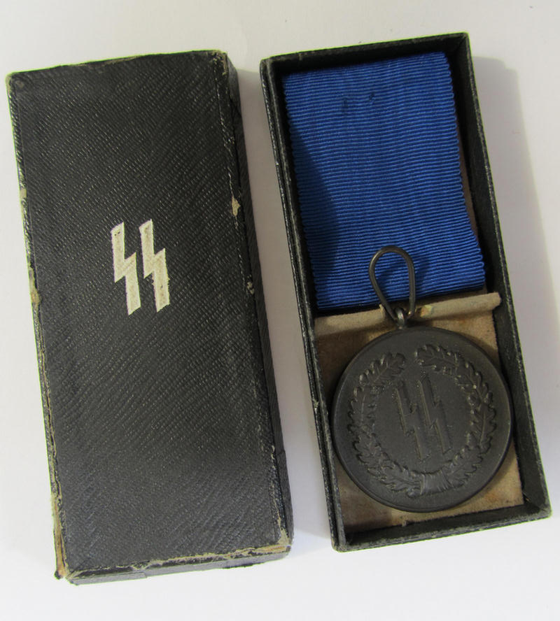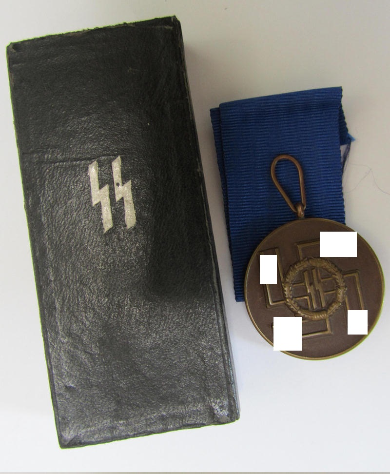 This is a very rare example of a 'SS-Dienstauszeichnung 4. Stufe - Medaille für 4 Dienstjahre', that is executed in bronzed ie. blackened 'Buntmetall' and comes in its (very rare!) black carton etui as issued, in very nice, mint condition. The piece - which is very nicely detailed as usual! - comes on its typical 'drop-shaped' ring ('Tropfenöse') and has never been cleaned nor polished. The piece comes with its original (15 cms. sized) corn-flower blue ribbon as issued. The (truly very rare!) black carton box is also in fine order: it has an undamaged (greyish) inlay and has the (almost undamaged) silver painted runes on the top. One of the sides of the box comes a bit loose (but is present and functional): it also shows some some slight wear from having been opened too often. The medal was always kept in the etui something that is reflected in the great condition in which it is was uncovered. This piece also originates from a UK soldier who brought this piece to UK as a 'veteran bring-back souvenir': it was never before in a collection. I have priced it according to its rairity and stunning condition!