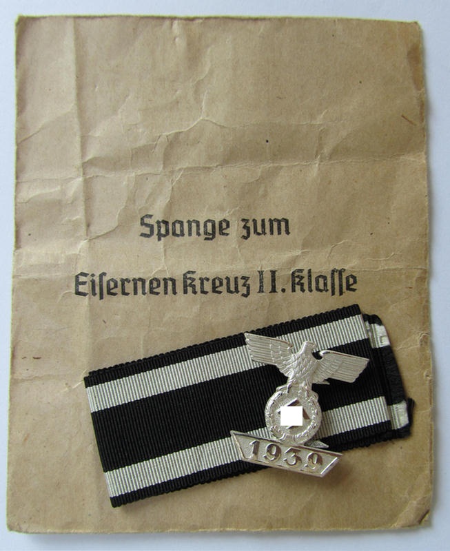 This is a truly superb 'Widerholungs Spange EKII' (bar to the WWI IC2nd class) as produced by 'Ziemer & Söhne', that comes in its (very rare!) carton pouch and 'Bandabschnitt' as issued, in very nice, mint/unissued condition. The piece still retains its 'high polished sides ('Hochpolierte Kanten') and is very detailed. Naturally are all original four prongs present: the piece is however not hall- or maker-marked. The piece was stored in its pouch for years and comes with its full-length and pre-folded (29 cms. long!) ribbon. The badge has of course never been cleaned nor polished and has a very nice 'frosted' appearance. The pouch - which is of the larger type - is executed in yellowish carton and just shows some slight usage and folds: it is in undamaged and functional condition. The pouch bears the makers'-mark: 'Ziemer & Söhne' based in Oberstein-Nahe. This piece also originates from a UK soldier who brought this piece to UK as a 'veteran bring-back souvenir': it was never before in a collection. Simply the best 'Widerholungs Spange' that I ever had on offer: I have priced it according to its rarity and stunning condition!