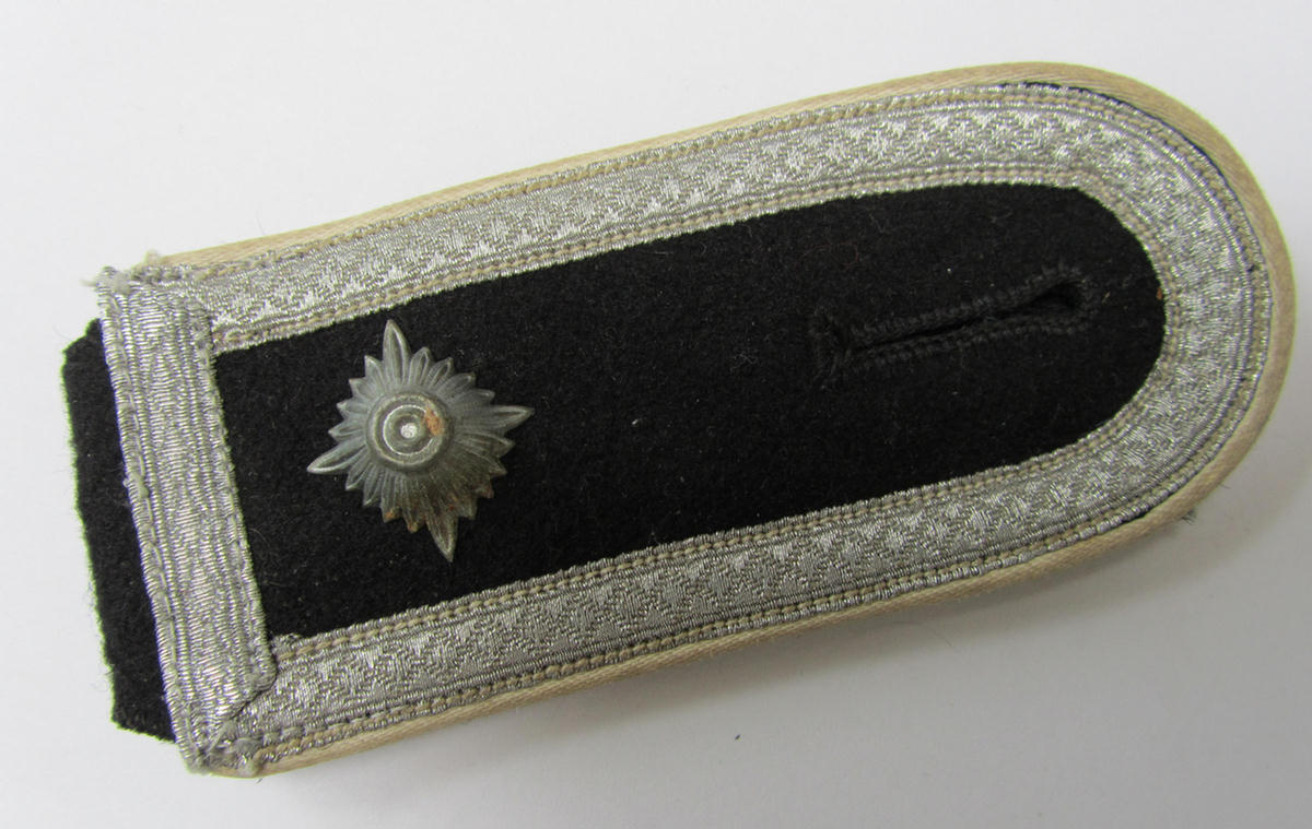 This is a nice and scarce example of a single, Waffen-SS NCO'-type Infanterie' (infantry) shoulder-strap as intended for an 'Oberscharführer der Waffen-SS' (sergeant first class) in very nice and only slightly used condition. The strap - which has a field-grey (Italian wool) underlay as to be expected - comes on its original (typical SS-type small-sized) tongue and has the neat 'silk-like' type, white coloured, piping. The board - which measures 11 cms. in length - has the silver-coloured 'standard' NCO braid attached and also has one (zinc-based) pip attached. It should be noted that white-piped Waffen-SS boards are extremely hard to find. This piece is clearly used and shows minor age and wear. This board was found together with the other 'Oscha.'-board which I offer under number: 20868. Both are slightly different in shape and execution and I therefore decided to sell them as single pieces. A garuanteed original and text-book SS shoulderboard!