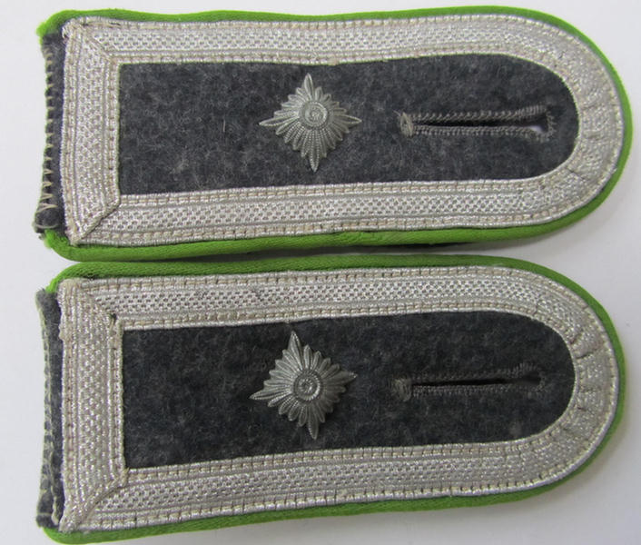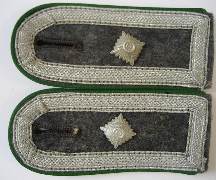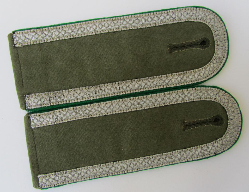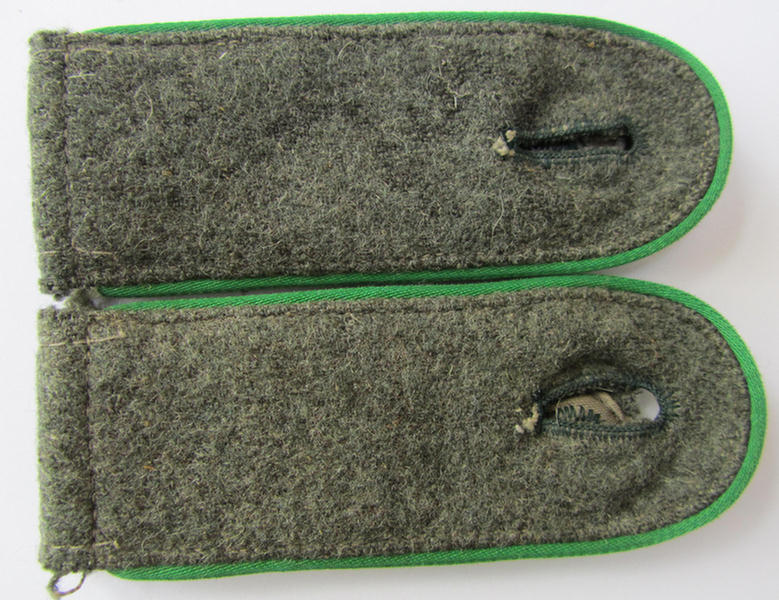 This is a very nice - and fully matching! - pair of (IMO) mid-war WH (Heeres) soldiers'-type shoulderboards, having the dark-green ('silk-like') piping, as intended for a soldier in a 'Gebirgsjäger' (= mountain-troops) unit. The boards - which measure 11,5 cms. in length - come on their original tongues and are in nice, text-book condition and show only minor wear ie. usage. These 'simple' soldiers'-type boards piped in dark-green are very hard to encounter: this is only the third such pair I have ever come across. The set originates from a private household and looks 'as if it was just removed from a tunic'. Simply a very nice and text-book pair of 'Heeres' boards in a desirable (and actually rare) branch-colour!