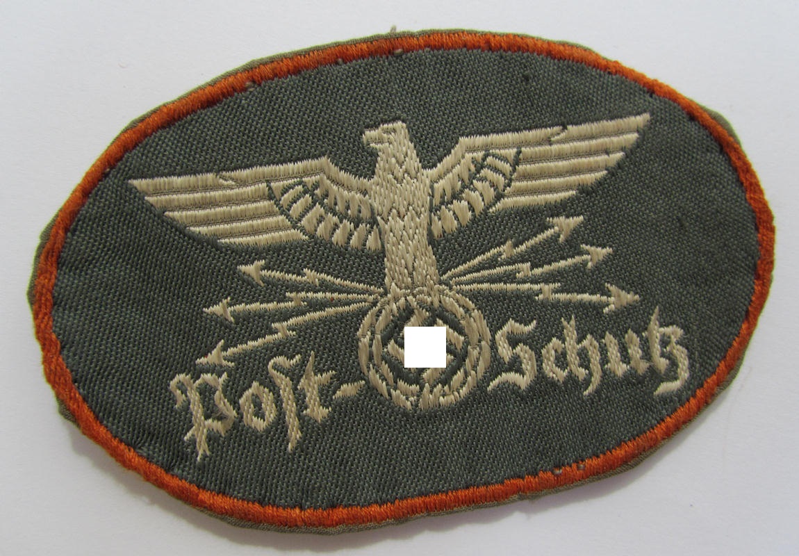 This is a very rare example of the BeVo-woven arm-badge i.e. arm-eagle: 'Postschutz', in nice, slightly worn and clearly uniform-removed condition. The badge - executed in light-grey cotton having an orange border - is sized approximately 10 x 6 cms. and is only sligthly used: it is already confectioned and folded and was most certainly worn. Is shows no damage but is slightly stained caused by normal wear. The 'Postschutz' organisation (which can literally be translated as postal security service) is one of the smaller TR organisation about which little is known: its 'political' i.e. police-related nature is also underlined by the left facing eagle. Simply a very rare BeVo armbadge!