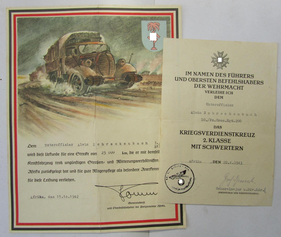 This is a truly very nice, small 'Panzer' ie. Afrikakorps DAK related document-grouping, comprising of 2 award-documents originating from the 'Unteroffizier' Alwin Schreckenbach, member within the: '3./Fla.Btl.606 and/or 10./Pz.Gren.Rgt.200, both in nice albeit used & folded condition. The - fairly rare - set comprises of the scarcely encountered so-called: Schmuckurkunde (commemorative award-document) specifically awarded by the famous Generaloberst u. Oberbefehlshaber der Panzerarmee Afrika, Erwin Rommel, to transport-soldiers (ie. drivers) that had accomplished an extensive mileage when stationed in the African desert. The soldier (ie.'Unteroffizier') Alwin Schreckenbach got his award-document for having accomplished 25.000 kilometers on 15 October 1942. The very decorative A-4 - ie. 27,5 x 21,5 cms. - sized document is not denazified nor damaged: it has just been folded into 4 parts and is somewhat yellowed by normal age. It bears a (facsimile) signature of Rommel. There is also an official, A5-sized, award-document for a Kriegsverdienstkreuz 2. Klasse mit Schwerter (war merits cross 2nd. class with swords). This latter one was awarded - also in Africa! - to Schreckenbach when he was a member of the 10./Pz.Gren.Rgt.200 on 20 April 1943. This latter document is signed by the (famous!) commander of the '90. leichte Infanterie- (ie. Afrika) Division' being 'Generalleutnant Theodor Graf von Sponeck' (who commanded this division from 1 November 1943 upto 12 May 1943 and was a RK-(ie. KC) bearer. As stated are both documents in overall very fine condition: they are not hole-punched nor denazified (just folded as is more often the case). Simply a nice little DAK-grouping that was always as such and belonged to a DAK- ie.Panzer-soldier (most likely a driver). I deem that this neat - and truly scarce! - document-grouping is priced according to its rarity.