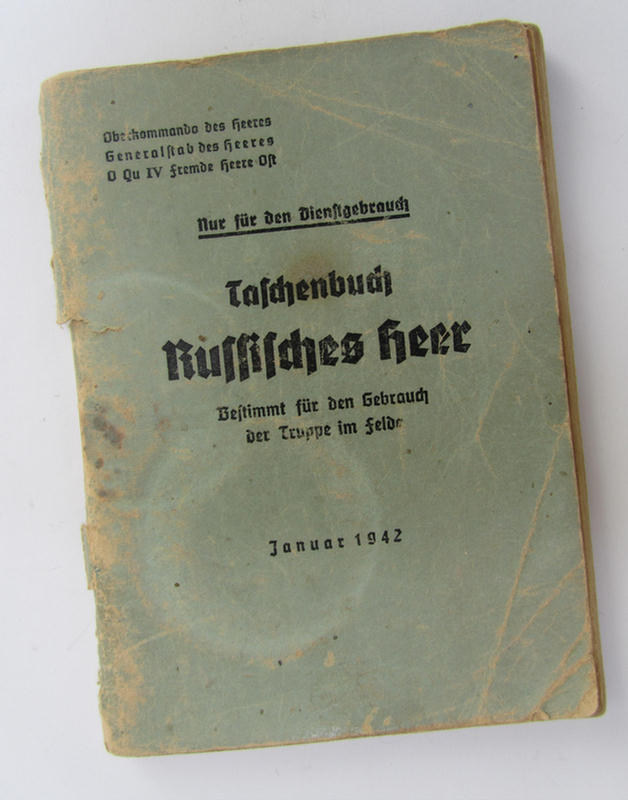 This is a truly rare example of the neat WH instruction-booklet (or 'Taschenbuch') entitled: 'Russisches Heer', as issued in January 1942 by the 'OKH' / Abteilung Fremde Heere Ost', in nice, albeit clearly used condition. The small-sized booklet - sized: 14,5 x 11 cms. - is complete and retains all its 92 (!) pages and is complete with its attached map. It is just somewhat yellowed and shows clear usage, caused by wear & normal age. As possibly known has this booklet been reproduced: this is naturally a fine original and period example! The booklet provides the reader with a complete insight in the WWII Russian army (from uniforms to weaponry and used equipment and strength), one and other illustrated by many drawings, illustrations and even colour-plates. It should be noted that these publications were issued at a very limited scale! Simply a nice and rare publication: it is just the first such piece I have ever encountered. A great addition to a field-gear/mannequin set-up!