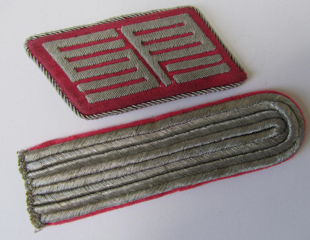 This is a nice item: a truly rare set comprising of a single collar-tab and shoulderboard, as worn by a technical officer ('Leutnant'-rank) within the 'Transportkorps Speer' (latest ie. 1944-based model, nice, albeit clearly worn and issued condition. The collar-patch - which is has extraordinary detail and is hand-embroidered on bright pink wool - shows the stylised characters: 'S' and 'P'. (The pink branch colour signifies that the bearer was a technical officer). The - matching! - board is of the sew-in type and is also in fine condition overall: both insignia show equal wear and age and originated from a private household, where they were recently found. The 'Transportkorps Speer' was a waterborne transportation service that was formed in 1943 and little is actually known about it: consequently do insignia of this service are hardly ever offered for sale. A nice set of inignia of one of the more 'obscure' services of the TR-period!