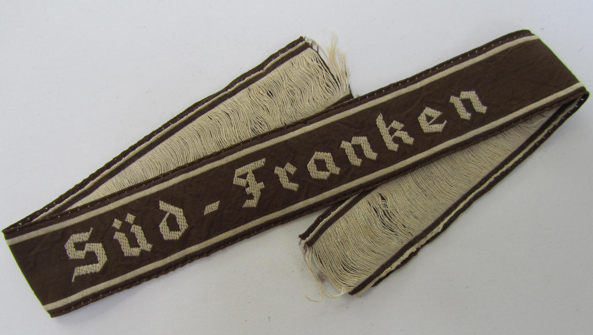 This is a very nice example of the rare HJ/BDM ('Bund Deutscher Mädel') cuff-title: 'Süd-Franken', executed in neat BeVo-weave, in cleary used & tunic-removed condition. The cuff-title - which is IMO slightly shortened and measures 34 cms. - is woven in white on a chocolate-brown coloured background. It was worn on the lower left sleeve and was awarded to BDM members who served as volunteers in the district of 'Süd-Franken'. The piece is clearly tunic-removed but is void of any damage (it shows some obvious fraying at both ends). Simply a very rare and desirable youth cuff-title which is not often offered for sale!