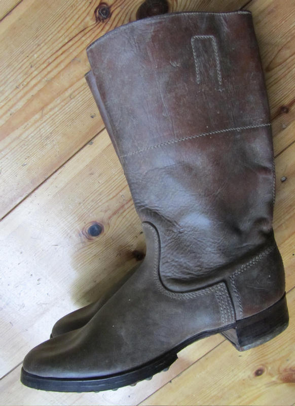 This is a beautiful and rare pair of matching WWII brown (ie. natural coloured) leather, WWII German boots (or 'Marschstiefel' ie. 'Knobbelbecher'), sized: '29 1/2' and nicely marked ('Rumpf'), in wonderfull (IMO never worn) condition. The pair shows some normal dust and aging: the leather, however, is very souple and fully functional. All iron parts (like the hub-nails) are a tiny bit rusty but all present. The boots are neatly marked: '25188 29 1/2 4 130' 5 (ink-stamped on the inside). Also the soles show a size- and maker marking. The pair - which measures 35 cms. in height - has never been coloured (ie. greased nor oiled) and shows a period, horizontal stitching-line in the middle of the boot (maybe done to 'strengthen' the leather). These are the 'real thing' and NO Eastern-European or post-war copies and I back this up with a life-time garuantee on the originality. Needless to mention how rare period German foot-wear actually is: mainly because these where also used after the war as 'regular' footwear, something that merits IMO my asking price. (Please note that these are quite expensive to ship: you can preferably mail me in advance to discuss this in detail). A very nice and text-book pair - that orginates from my own collection - that would look super if mounted on a mannequin!