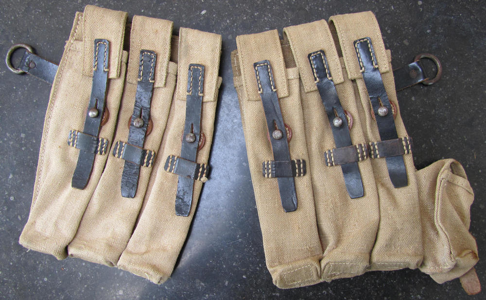 This is a (nowadays fairly rare!) pair of fully matching WH (Heer or Waffen-SS) yellow linnen (ie. sometimes IMO wrongly referred to as tropical) coloured MP38-40 magazine-pouches, which are neatly maker-marked: 'CLG 43', in very nice (IMO mint, unissued!) condition. Both pouches are in a very nice condition and seem to have not been used: they just show some minor dust and age simply caused by decades of storage. Both are nicely (and identically) stamped on the back with the 3-digit makers-mark: 'CLG' (signifying that they were produced by the company: Ernst Melzig based in Liegnitz), a clear 'Waffenabnahme' stamp and a date: '43'. The (black-coloured) leather straps of both pouches are fully functional: none of the (fragile) straps is broken nor damaged. These original MP pouches are getting harder to find and this set would look great if re-mounted on a mannequin. A nowadays hardly ever offered for sale set of original and matching MP 38/40 pouches!