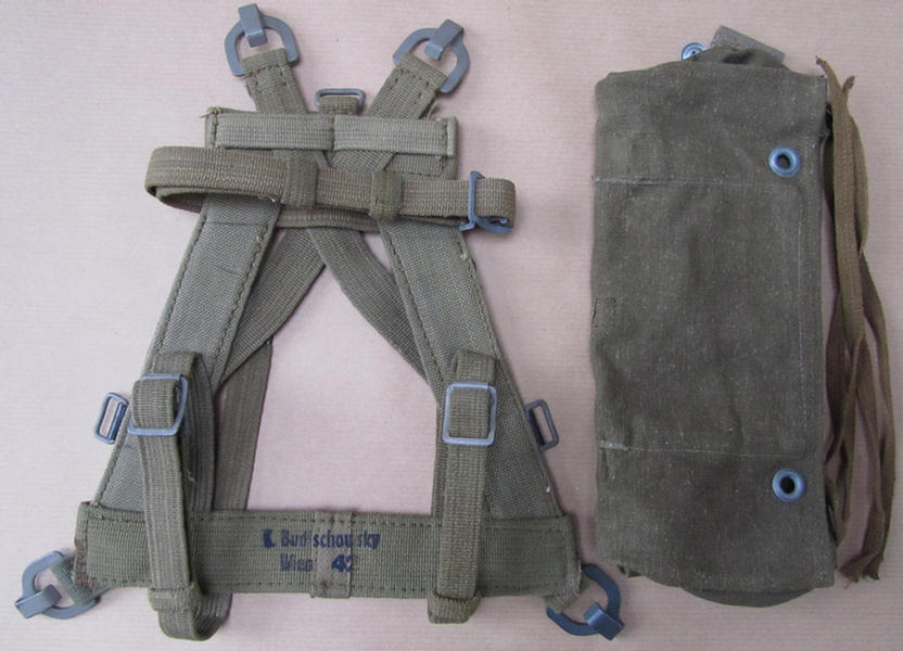 This is a truly fantastic and IMO only slightly used, WH 'A-Frame' ('Gefechts- or 'Sturmgepäck') that comes complete with all its cloth lashes, metal-loops and tan-coloured linnen straps present. The frame - which was recently found at a private household - comes complete with its specific horizontal strap and 'tropical' pouch. Of interest is the fact that the pouch is NOT of the 'tropical' version: both small straps (visible on the picture are fabricated from leather and not from webbing (as to be expected): there is however no doubt whatsoever that this set was always together as such. The pack and pouch are naturally fully functional and complete and both show a clearly readable date and producers' stamp ('C. Budoschowsky - Wien - 1942') stamped in blue-ink. The 'pack' is only sligthly used and does not show any rust nor damage (both its metal rivets are original to the frame and were not re-mounted - or re-rivited - or alike). This one was surely issued and used and can IMO be graded as a true DAK ('Afrikakorps') item. All metal parts still retain their greyish (anodized) finish (and do not show rust or alike). The piece comes with its (rare!) specific, horizontal (all webbing) strap having two loops, intended to hold the mess-tin. On the back the piece shows two ink-spots (inked-out name?) and shows a stamped number: '741'. I personally have never encountered a 'matching' set and deem this a rare item (something that IMO also merits the high asking price). A truly nice and scarce piece of equipment which is IMO almost impossible to upgrade!