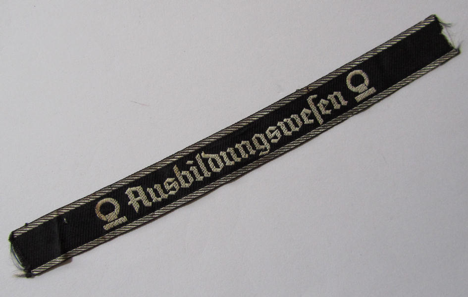This is a very nice and never before encountered armband entitled: 'Ausbildungswesen' (education department), as intended for employees of the 'Reichswerke Hermann Göring', in nice and only slighty used and IMO worn condition. The band - woven in the neat 'BeVo'-weave pattern - measures 20 cms. and is IMO full-length: it is comparable with the size and format of the HJ 'sports'-armbands, such as 'HJ-Sportgeländewart'. The piece shows the text: 'Ausbildungswesen' which is preceded and followed by the logo of the 'Hermann Göring Werke'. The piece is woven in silver-grey linnen and shows silver-white woven text and logos. I have never before encountered such armband and could not find any reference for it. I am convinced that it is a piece of great rarity and a piece that would surely merit further investigation.