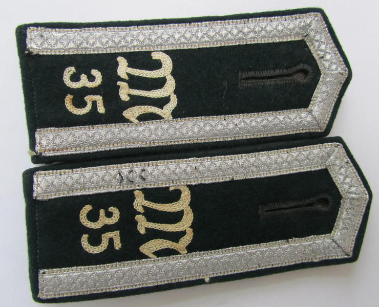 This is a truly rare pair of WH (Heer) M36-model, 'pointed' type-, 'cyphered', shoulderboards, as intended for an 'Unteroffizier' within the '35. Maschinengewehr Regiment der Infanterie' (= infantry machine-gunners regiment 35), in very nice, but clearly used & worn condition. Both - non-piped! - boards have the nice, regimental numbers/cypher: 'M 35' embroidered, in neat, so-called: 'Kurbelstickerei' and have the nice, 'standard', silver-coloured NCO-braid originally attached. Both boards are executed in dark-green wool and have functional tongues (which are both ink-stamped: '18'). The set is IMO fully matching (identically fabricated in all details) but differs very slightly in size (which is IMO not a big issue): the boards measure each approx. 11,5 cms. The numerals and cypher are embroidered in white linnen (signifying that the 'M 35'-regiment resided under the 'Infanterie'). It should be known that all 'cyphered' shoulderboards are considered rare and are very collectible, something that IMO merits its asking price. Simply a very nice pair that would look awesome if re-attached to an early army tunic!