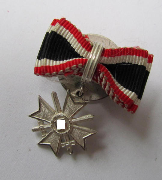 This is a nice and actually very rare item: a high-quality, 17 mm. sized, so-called: 'Halbminiatur', as intended for the 'Ritterkreuz des Kriegsverdienstkreuz mit Schwerter' (KVK Knights' Cross) that is neatly maker-marked: 'LDO' and 'Steinhauer u. Lück', in overall very nice condition. The piece - which still shows the polished sides ('Hochpolierte Kanten') - comes mounted on its original ribbon and retains it 'original button-hole' attachment device. The piece has truly extraordinary detail and is in a very nice condition overall: it is just amazing how much detail this tiny piece has (the pictures do actually no justice to this piece). The miniature was recently found at a German flea-market and was never before in a collection. In the Detlev Niemann medal-catalogue it is valued with 800 Eu! The piece was found together with the other KvK minature pin which is offered under nr. 21698: both belonged to the same bearer. Simply a very nice and rare piece!