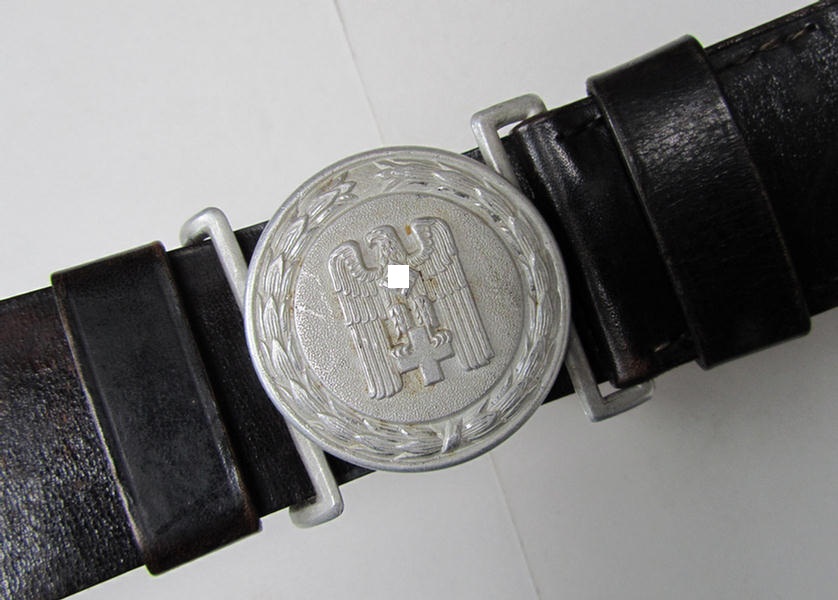 This is a really nice and rare 'DRK'('Deutches Rotes Kreuz' or German Red Cross) item: a truly rare & complete aluminium-based 'DRK' officers'-type buckle (stamped: 'Ges.Gesch. 2'), that comes on its original, black leather belt (also stamped: 'Z.D.V.R.K.') as issued and worn. The buckle - which is in used but still very nice condition - is neatly stamped on the back: '2' & 'Ges.Gesch.' and comes with its original so-called: 'Gegenhaken'. The buckle is - as per regulation - firmly affixed to a part of the (black-coloured) leather belt (which is fully souple and functional). Also are both leather belt-loops present. The belt is clearly stamped with a 'red cross'-sign, followed (and preceded) with the stamped abbreviation: 'Z.D.V.R.K.' (of which I do not know the exact signification). This very nice belt-buckle set is IMO only slightly used: so the overall condition is still nice showing only minimal wear & age. (Also the buckle - which shows some minimal dust and dirt - retains extraordinary detail). I assume that the stamped '2' signifies the buckle's maker, presumably the company: 'F.Hofstätter'. This type of belt/buckle was worn by (the officer-ranked) staff ranking from: 'DRK-Wachtführer' upto 'DRK Oberstführer': the higher officer-ranks wore a golden toned version. A truly nice & rare buckle/set: the first such set I ever had on offer!