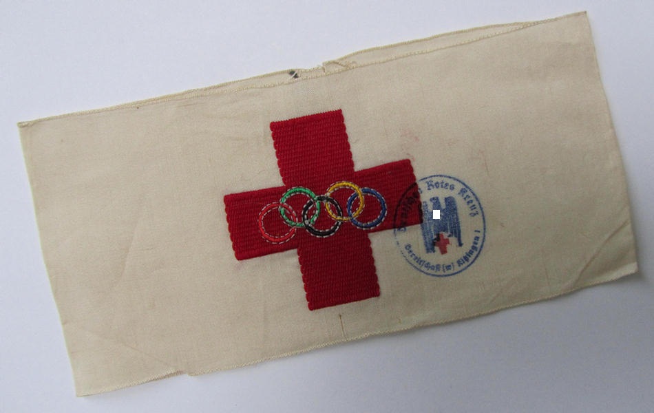 This is a neat example of a never before encountered, semi-woven armband 'Deutsches Rotes Kreuz', that saw usage during the Berlin held Olympic Games of 1936, in very nice & slightly used (IMO almost mint), condition. The band is beautifully woven using a technique similar to other 'BeVo'-insignia. The band has very bright colours, and is sewn together as per regulation (it is in full-length condition and measures: 39 cms.) It bears a (bright) bluish-inked unit stamp ('Bereitschaft'), stating that this piece was assigned to a member of the: 'Deutches Rotes Kreuz'. These bands were most likely worn by the various medical orderlies of the DRK (ie. 'Sanitäter') that served during the Olympic Games of 1936, held in Berlin. The piece might need some slight ironing: it has just been stored for years and has some (very faint) staining and age. A nice and surely rare armband for the DRK i.e. 'Sanitäter' or 'Olympic Games' collector!
