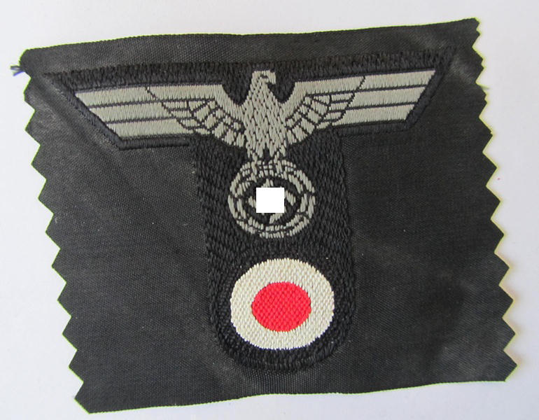 This is a very rare WH (Heer) so-called: 'T-shaped' M42-cap eagle/cocarde, executed in so-called BeVo weave style. The eagle/cocarde is executed in bluish-grey on a black background: thus being specifically intended for the black caps of the 'Panzertruppen'. The eagle is in mint, unissued condition and cannot be upgraded (it might just need some ironing). These 'T-shaped' eagles were specifically produced for the impopular M-42 cap, but were used also on the M43 caps. The green T-shaped eagles are already scarce: the black 'panzer' ones are really rare! This eagle - which is a truly rare example - originates from an old collection of fine, original cap-eagles I recently acquired. I should be noted that these are regrettably often copied: this is of course a fine original. A very nice and desirable cap eagle: maybe the rarest of the PZ eagles!