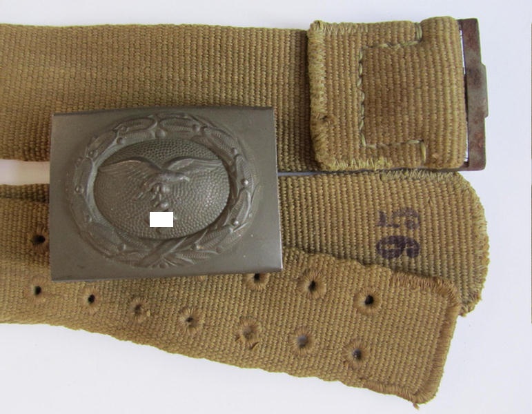 This is a truly nice & rare example of a WH (Luftwaffe), unmarked truly green-coloured (!), steel-based belt-buckle ('Felddivisionen'), that comes on its ('all webbing' fabricated) tropical belt, sized: 95 cms., in nice, albeit slightly used condition. The belt is neatly ink-stamped with its size: '95', but is void of a makers-mark or stamp (which is not uncommon). The tongue is also entirely fabricated in linnen (which is not always the case). As stated is the buckle truly green-coloured (making it IMO a rare 'Felddivisionen'-item). The overall condition of belt and buckle is very nice (the buckle shows only minimal usage and the belt shows some fading caused by regular wear). The metal catch is green/field-grey coloured, but shows some minor rust-stains as is more often the case. It should be noted that these 'green-coloured' belt-/buckle sets are very rare and hard to find. In order to see the difference between a green- and blue buckle I have photographed it with a comparatable piece: the difference in colour is as such more obvious. Simply a very nice LW item: great to use on a 'Felddivisionen' mannequin!