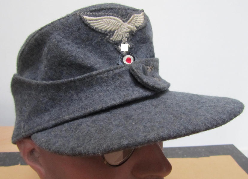 This is a very fine example of a WH (Luftwaffe) so-called 'M43 field-cap', that is nicely ink-stamped with an 'RbN.nr.('0/0629/0004') and dated ('1944'), in very nice, and only slightly used condition. The cap - executed in 'regular'- blue-grey LW cloth has no damages nor mothing whatsoever and is nicely 'RbN.' marked (ink-stamp: '0/0629/0004') and dated: '1944'. The cap measures 58 cms. (which is a great size for a mannequin!). The cap has a (factory applied ie. machine stitched!), cap eagle originally attached (by means of 'zig-zag' stitching) and also retains its 'BeVo'-woven cocarde (also factory sewn). The cap just shows some very slight staining (IMO just caused by slight wear). These caps are not that hard too find: the ones with original applied insignia are! Simply a very nice and original example of a text-book 'Luftwaffe' M43-cap that is IMO almost impossible to upgrade!