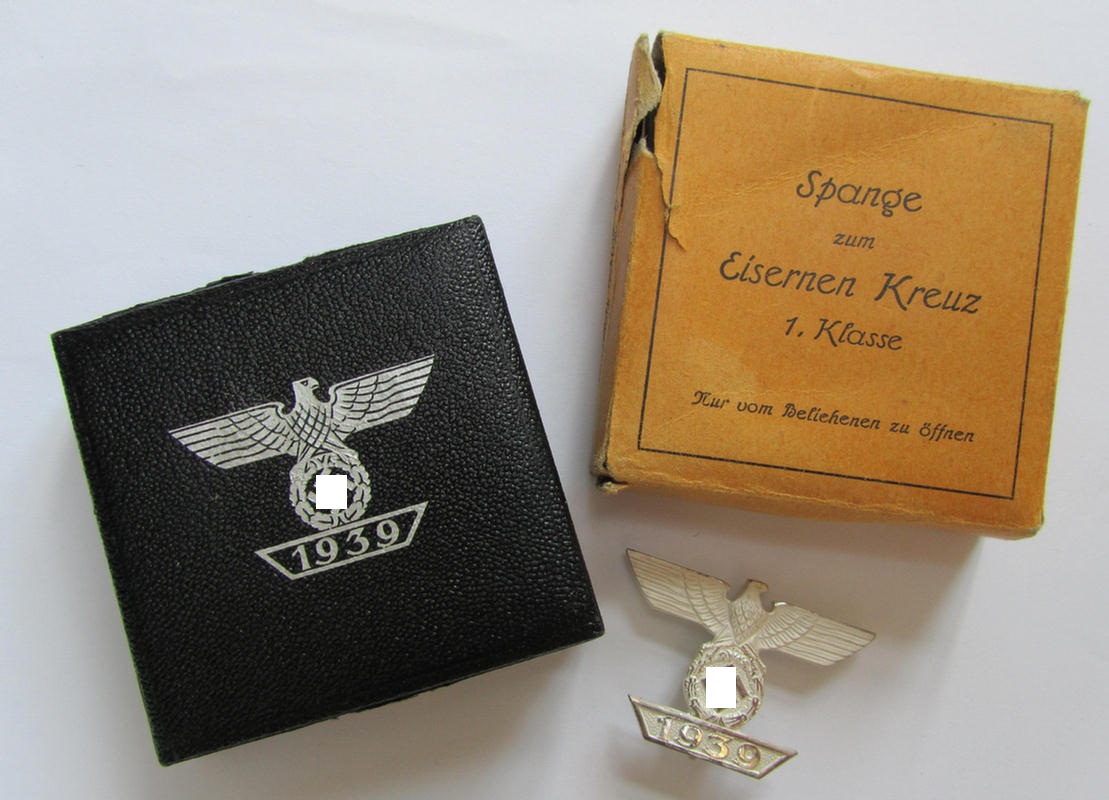This is a truly superb 'Widerholungs Spange EKI' (bar to the WWI IC 1st. class) as produced by the 'B.H. Mayer' 'company, that comes in its (very rare!) carton 'Überetui' and simulated leather box as issued, in very nice, mint/unissued condition. The piece still retains its 'high polished sides ('Hochpolierte Kanten') and is very detailed. Naturally is the original pin/catch set-up present and functional: the piece is however not hall- or maker-marked (which is not unusual). The piece was stored in its etui for years and is as mint as when it left the factory. The badge has of course never been cleaned nor polished and has a very nice 'frosted' appearance. The simulated leather etui is in great condition and retains a full (silver-coloured) badge on the top. The orange-yellow carton 'Überetui' shows some slight usage and two minor tears: it retains all (small) flaps and is in a functional condition. The 'Überetui' bears the makers'-mark: 'B.H. Mayer' based in Pforzheim. This piece also originates from a UK soldier who brought this piece to UK as a 'veteran bring-back souvenir': it was never before in a collection. Simply the best and most complete 'Widerholungs Spange'-set that I ever had on offer: I have priced it according to its rairity and stunning condition! It should be noted that this set was already on my site but now I can offer it for a more interesting price.