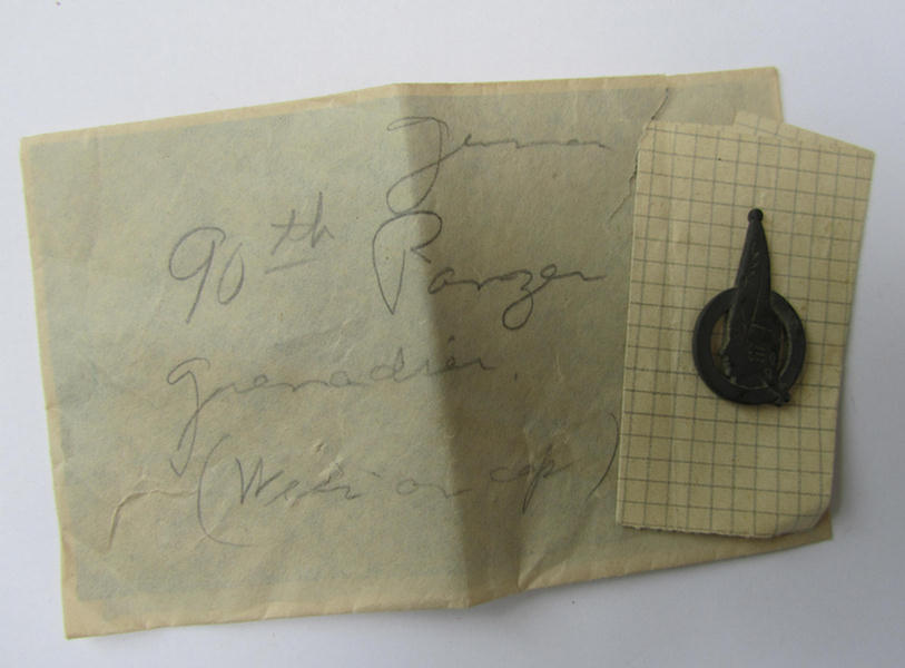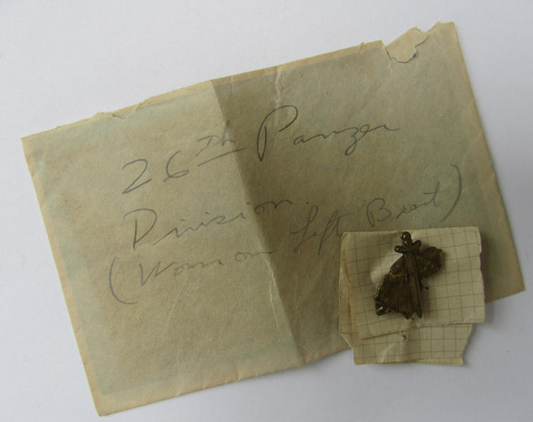 This is a rare & unusual item: a very nice example of the pin ('Tradition-/Erinnerungsabzeichen') of the '26.Panzer-Division' (depicting a 18th century German soldier) in nice, albeit used, condition. The pin is in a nice, albeit used condition: it is made of dull-grey toned 'zinc' metal and has some darkened age patina & shows some dirt. It has IMO surely been worn and has lost most of its silverish finish. The - non maker-marked - lapel-pin shows fair regular wear and tarnish. These 'semi-official' pins were worn on both the M43 caps and civil attire. The pin - which comes on its copper-toned prong (of which one side is missing) - is also figured in the Heering-Hüsken catalogue (nr. 9838A). Of interest is the fact that this example was 'liberated' by an American GI and was kept & stored for years in a paper enveloppe, showing the pencil-written text: '26th Panzer-Division', worn on left breast' (which in fact is incorrect: it was worn on the side-cap or M43 cap!). It came together with the badge of the 90th Panzer-Grenadiere Division, which is offered under number: 21642. A very nice and desirable 'Panzer-related' item!
