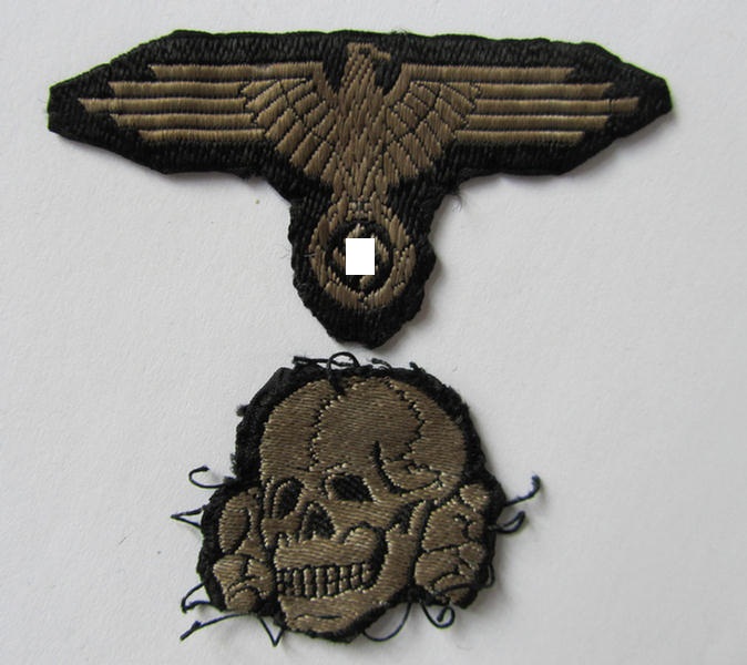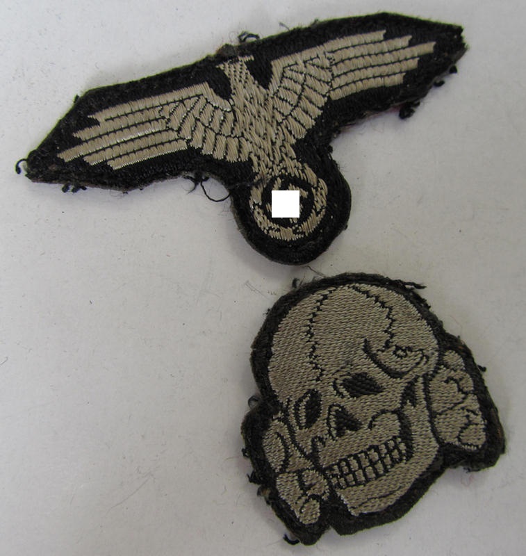 This is a very nice and nowadays rarely encountered set comprising of a (fully matching!) Waffen-SS 'BeVo' style cap eagle and accompanying skull, both in used and clearly cap-removed condition. Both are neatly executed in so-called 'BeVo' weave style (they are both executed in greyish-blue linnen but have turned a bit yellow over the years) and can easily be re-mounted on a Waffen-SS side-cap or even M43 cap. Both pieces show the remains of the threads with which they were once attached to a cap. The skull is of the smaller-sized type (having the neat 'light-blue' coloured inner-thread). Both insignia show only some minor staining and age, most certainly caused by regular wear. Both show clear proof of having been cap-removed: they still show stitching remains and old threads. Simply a very nice set that is not cheap but nowadays fully worth its money! I only sell these two as a set: I do not sell the skull separately. These original sets are almost impossible to find. I deem this by far the best 'cap-removed' set I ever had on offer!