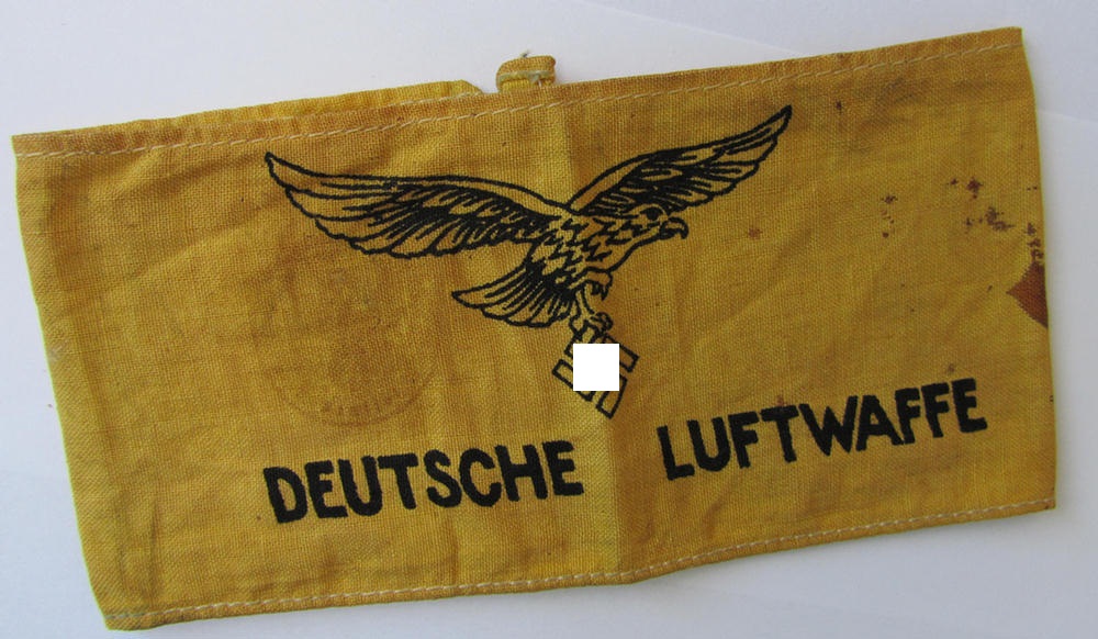 This is a nice and unusual item: a truly extremely rare, late-war, printed armband entitled: 'Deutsche Luftwaffe', which was exclusively worn by German pilots in order to identify them as such in case of an emergency landing, in very nice, albeit slightly used condition. These printed armbands became standard issue of the pilot-equipment later in the war, when it occured that German crew-members were thought to be allied pilots and were shot or molested by the German population 'as revenge on bombing their cities'. When wearing their full flight-gear it was hard to identify them as either Allied or German air-crew members! The band on offer here shows a blue-coloured, printed stamp (impossible to read though) and is printed in black on yellow-coloured linnen and measures (folded): 38 cms. It is clearly used and shows some slight staining and wear (it is also a bit wrinkled). These bands are known to have been copied: this is however a nice and rare original example: the first one I have ever encountered! Simply a great LW pilots' equipment item that is often missing!