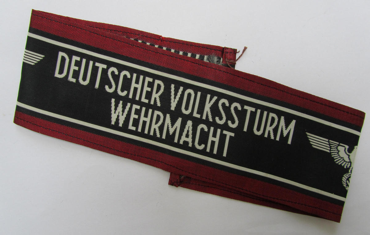 This is truly extremely rare specimen of the 'BeVo'-woven version of the late-war 'Deutscher Volkssturm' armband, as was used by the 'last ditch troops' of 1944/1945. The band is IMO in slightly used condition and has finished borders but is not sewn together. This one is full-length (sized: 41 x 7 cms.) and shows some slight staining caused by minimal wear (nothing shocking though). These 'woven' examples are truly very rare to encounter: this is just the second example I have ever encountered: it was already once listed on the site but was maybe overpriced: I can now offer this truly nice and rare item for a more attractive price!