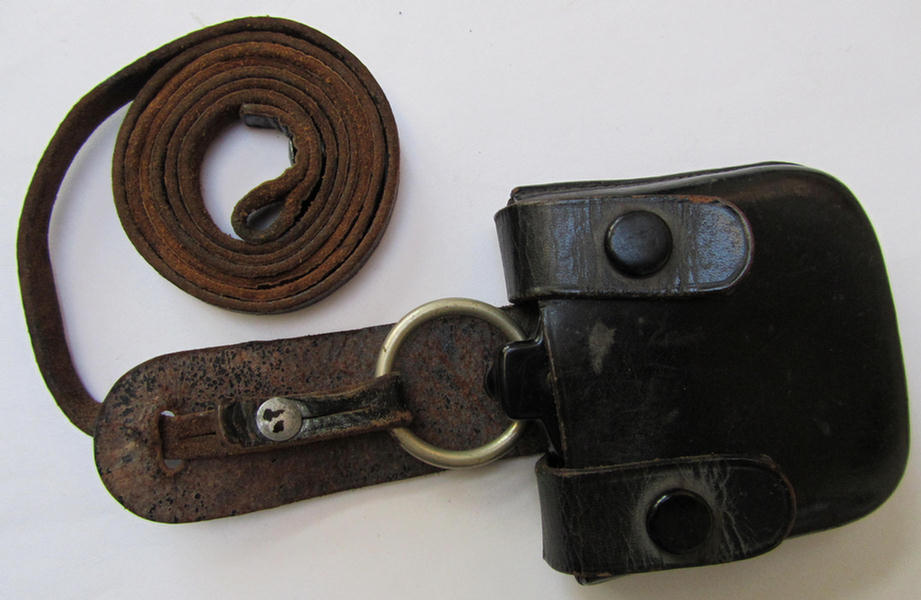 This is a not that often encountered item: a scarce, standard WH compass, executed in black-coloured 'Bakelite', maker-marked: 'Busch - Rathenow', which comes in its original leather casing and accompanying carrying lash, all in clearly used but functional condition. The compass - which is still fully functional - is in nice and complete condition. The leather casing is also in a used condtion and shows fair usage and/or wear. The casing is neatly stamped with a clear 'WaA'-mark. Both 'snaps' are somewhat rusted and dirty but are still fully functional. The compass comes with its originally attached leather lash (still retaining its two black coloured metal-based snaps). The entire set shows regular wear and age but is IMO still in a very nice and collectible condition. A nice piece of personal equipment: great to complete a mannequin set-up!