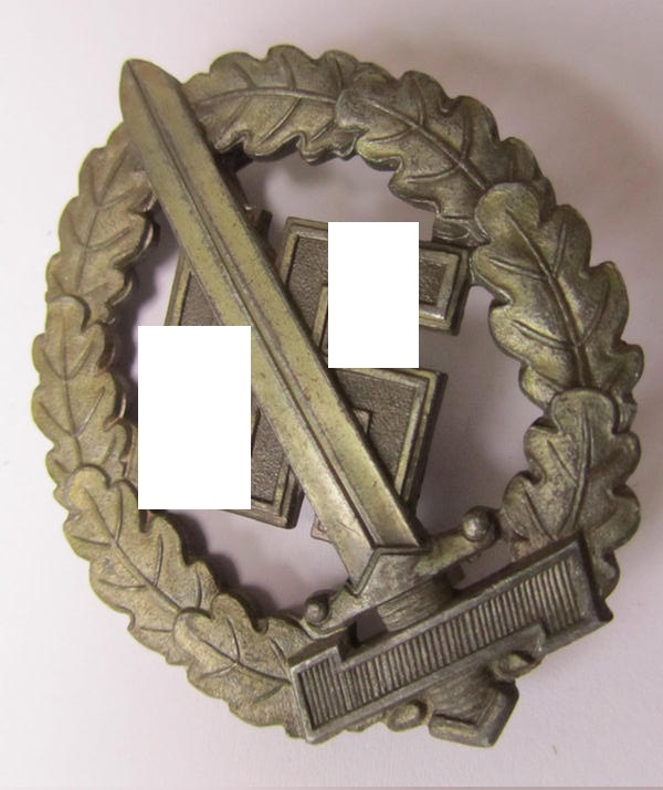 This is a nice example of the fairly scarce 'SA-Wehrabzeichen für Kriegsversehrte' (SA sportsbadge for war-disabled), which is an 'RzM M1/100'-marked, bronzed zinc (ie. 'Feinzink') piece, in overall nice, albeit issued and worn condition. The piece still retains most of its bronzed finish (which is somewhat light-coloured as more often with these badges) and shows - as stated - a makers'-mark that reads: 'RzM M1/100'-marked, (as is common for this type). The piece comes on its (flute-shaped) copper-toned needle and has (naturally) a functional pin- and catch set-up. The piece has a nice and somewhat darkened age-patina but was never cleaned nor polished. A nice and not that often encountered 'Sportabzeichen'!