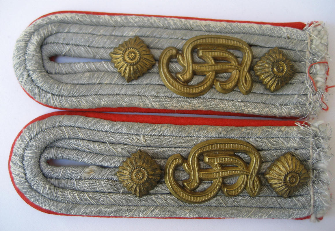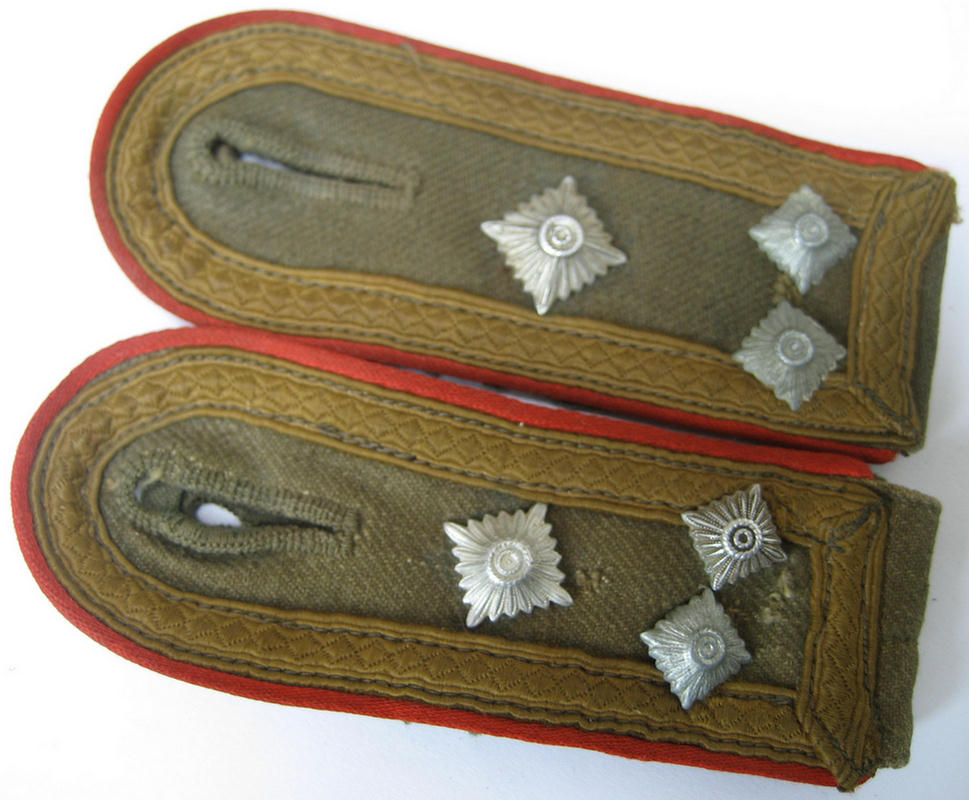 This is a nice and scarce item: a text-book, IMO mid-war, fully matching pair of cyphered shoulderboards, intended for a officer ('Hauptmann der Sturm-Artillerie') of the famous 'GrossDeutschland' division, in nice, only slightly used condition. The - bright-red piped - boards are executed in fine 'moleskin' wool and are clearly used and show normal wear and age. The boards have both identical (golden-coloured) 'GD' cyphers and four golden-coloured (identical) pips originally attached. Both are of the 'sewn-in' type and never had any tongues: they are neatly uniform-removed. A truly scarce pair from a famous 'elite' division: great to complete a tunic or wrap-around jacket!
