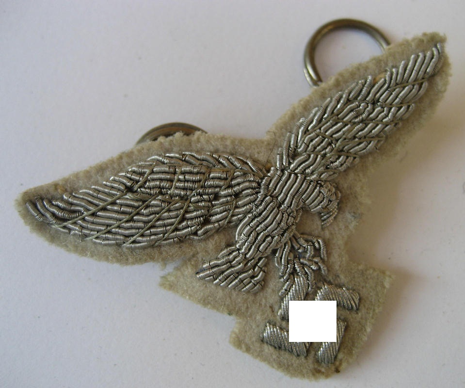 This is a truly rare WH (Luftwaffe) (removable) officers' visor-cap eagle, hand-embroidered on white wool, as was used for the white-topped LW officer-type visor-caps. The eagle - which is IMO clearly used and cap-removed - is in a nice condition overall: it shows some minor discoloration and staining and still retains it copper-coloured back-plate (having two rings attached for easy affixing/removing it to/from the cap). The eagle has great detail (extraordinary embroidery!) and can of course easily be used to restore a white-topped LW cap. A truly rare piece of cloth insignia!