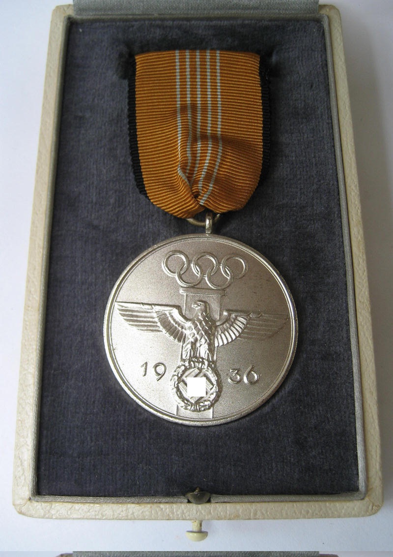 This is a very nice example of the commemorative medal, awarded to participants that assisted and helped in organising the in 1936 in Berlin held Olympic Games. This medal (named: the 'Deutsche Olympia Errinerungsmedaille') came in a white, simulated leather etui. This example is in very nice condition and has never been cleaned nor polished (nice age patina) and has great detail. The box - lined in dove-grey - is in very nice condition and retains all golden finish on the top. The medal comes on it original (small sized and orange-red coloured) ribbon and copper-coloured pin for attaching it to the uniform. A very nice and not that often encountered set: impossible to upgrade this example!