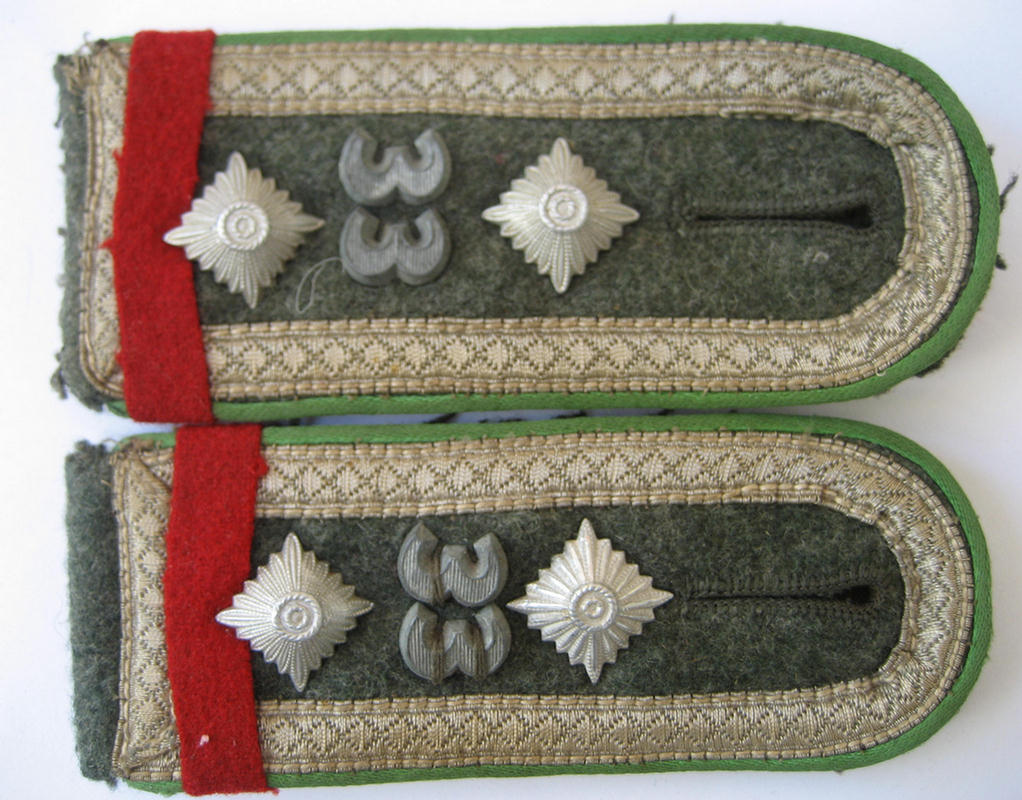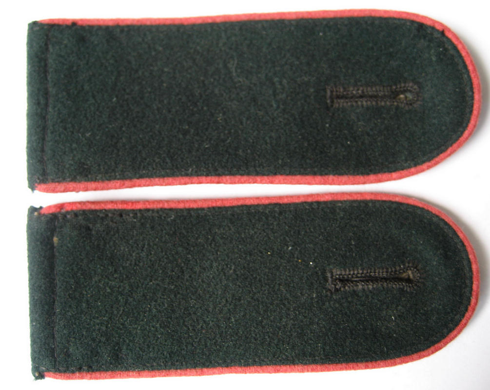 This is a very nice - and fully matching! - pair of WH (Heeres), mid- ie. late-war, NCO-type shoulderboards, having the bright-green ('silk-like') piping, as intended for an 'Oberfeldwebel' (sergeant 1st class) in the 'Panzergrenadiere' unit (= rifle regiment), numbered: '33' . The boards - which measure 12 cms. in length - come on their original tongues and are in a nice, text-book condition and show only minor wear and usage (some age and staining is visible though). Both have a field-grey woolen deck, standard WH-type 'yellowish' NCO-braid, four identical (aluminium) pips and two sets of '33' numerals, originally attached. Of interest is the fact that on one of the boards the '33' numerals got loosened: they are period stitched to the board. Also is are the period 'added' red (woolen) felt stripes of specifc interest. It should be noted that 'Heeres' shoulderboard-pairs piped in this nice branch-colour are very hard to come by and regarded scarce. Simply a nice pair of truly used 'Panzergrenadiere' boards that can easily serve to complete a mid-war NCO 'Heeres' tunic. Maybe the best 'Pz-Gren.' pair I ever had on offer!