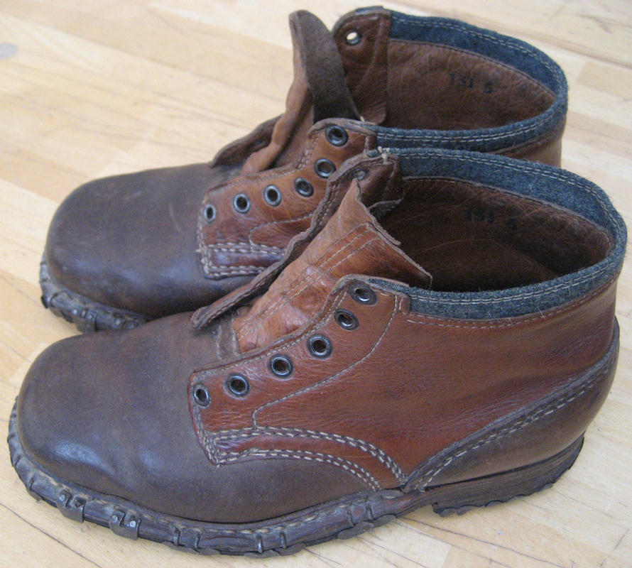 This is a matching pair of WH (Heer) 'Gebirgsjäger' (mountain-troops) boots, which are 'RbN.' numbered and dated '1944', in very, nice almost mint, condition. The (heavy) boots are in gorgeous condirtion and were almost never polished nor greased: they still retain there 'light-brown' ie. natural coloured leather appearance. The pair comes without leather laces (which are however easily replaced) and has undamaged 'green-wool' shafts as per regulation. They are a fair size ('26') so will easy fit a mannequin: the inside is nicely and clearly 'RbN.' stamped: '0/0674/0016' and bears the additional stamp (date) '27 06 44'. The metal nails are almost entirely present: one shoe misses one or two nails (which is IMO not shocking). Pls. note that this is a very heavy item, something that acquires a vast postage-ammount to sent. In any case a very nice item that is not often offered for sale!
