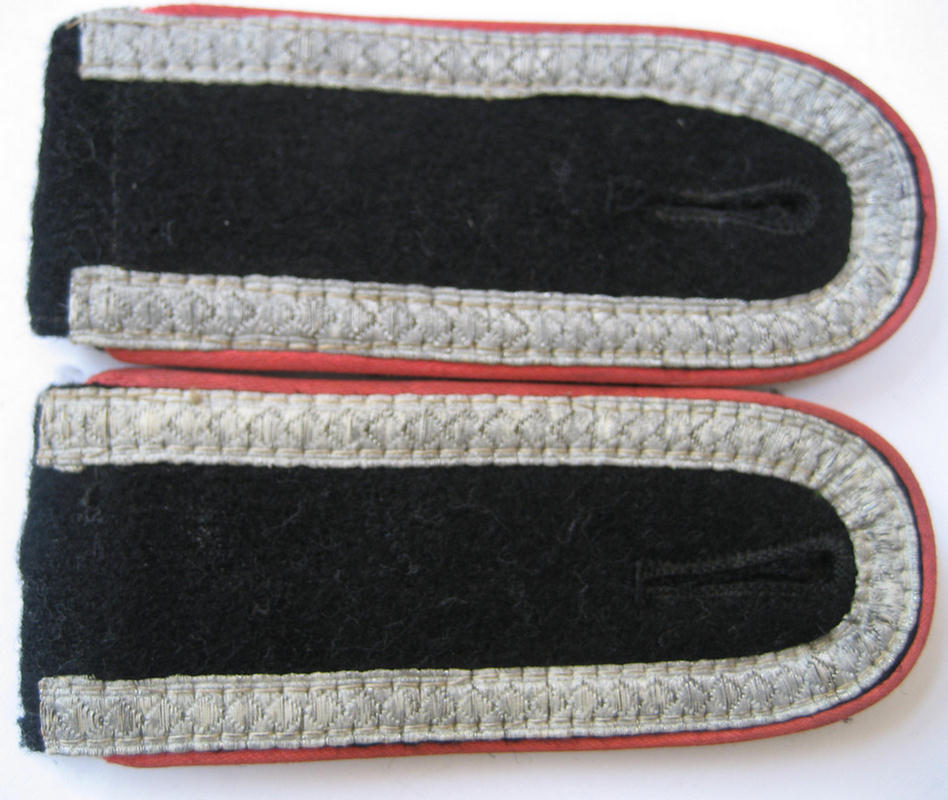This is a neat - and fully matching! - pair of WH (Heer) IMO of mid- ie. later-war model, 'Unteroffizier'-type shoulderboards, as intended for and worn by an NCO ('Unteroffizier') of a 'Panzer' regiment, in nice only slightly used condition. The boards are entirely executed in black (somewhat 'course') wool and have the neat silverish 'standard' NCO-braid and bright-pink 'silk-like'-type piping attached. The pair shows only moderate wear & age and was found as such (one of the boards shows some minor damage on the back which is not visible from the upperside). A truly scarce pair in a very desirable branch-colour: great to complete any black Heeres 'wrap-around' tunic!