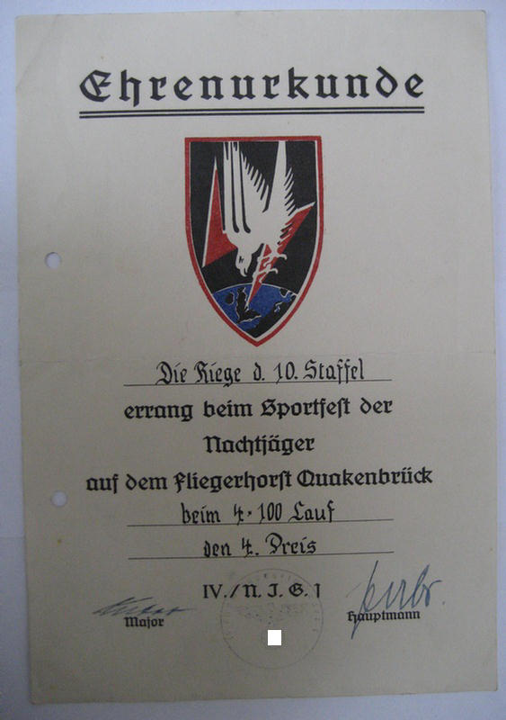 This is a nice and surely unsual award-document entitled: 'Ehrenurkunde des Sportfest der Nachtjäger auf dem Fliegerhorst Quakenbrück', in overall nice condition. The document - which shows the nice and colourfull logo of the famous 'Nachtjagdgeschwader 1' - is actually the 'fourth' price and was awarded to the (entire) 'IV.N.J.G.1' (being the 4th 'Gruppe' of the 'Nachtjagdgeschwader 1'). IMO is the document - amongst others - signed by the famous LW 'Nachtjagdgeschwader' ace named 'Hauptmann Helmut Lent', who was KIA in October 1944. Lent was awarded a 'Ritterkreuz' (on 30 August 1941), the 'Eichenlaub' (6 June 1942), the 'Schwerter' (2 August 1943) as well as the 'Brillianten' (31 July 1944). It is also signed by an unnamed 'Hauptmann'. The document - which is sized: 24 x 16 cms.) was once folded into two and is regrettably hole-punched but not denazified. Still a very nice and decorative LW 'nightfighter' related document that is not often offered for sale!