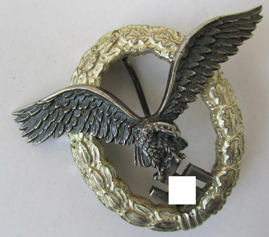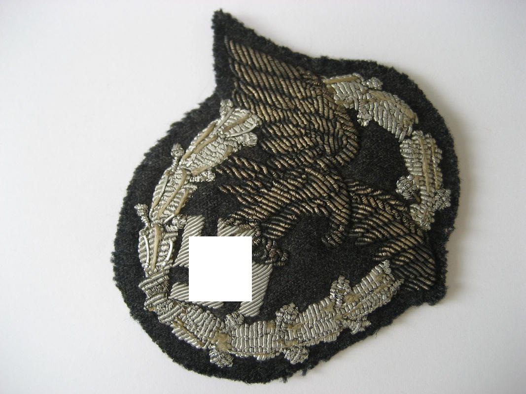 This is a nice - and actually rare - WH (Luftwaffe) 'Beobachter Abzeichen' (observers) badge, so-called: 'officers' version', which is executed in hand-embroidered silver-thread, in nice, slightly used and IMO uniform-removed condition. The badge is naturally a fine original, something that is obvious if one considers the neat multi-coloured threads and very detailed embroidery used. It is not backed, clearly showing the stitching-techniques used: it shows some 'wear-marks' and has acquired a darkened tarnish over the years. The detail is absolutely stunning! This one would surely look nice on a 'LW Fliegerbluse' and is a good (and much cheaper!) alternative for its metal counterpart! A very nice and desirable LW badge!