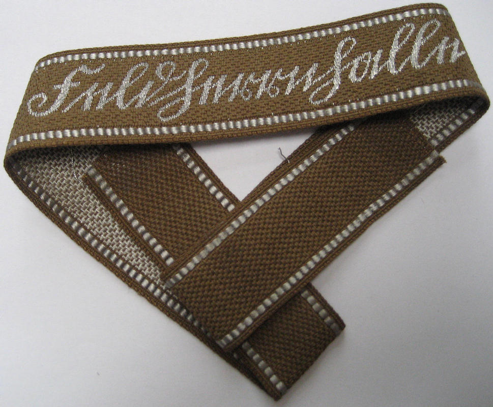 This is a truly superb example of the very rare flatwire woven - thus officers-type - golden-brown-coloured cuff-title: Feldherrnhalle, that comes with its original RzM etiket, in stonemint, unissued condition. This cuff-title was worn by the officers of the in 1943 formed 60. Panzer-Grenadier-Division Feldherrnhalle. The building named Feldherrnhalle - situated in München - was the site of the unsuccessful Beer Hall Putsch of 1923, in which the NSDAP attempted to seize governmental power and in which sixteen NSDAP members were killed by the police. After the NSDAP gained power in January 1933, the Feldherrnhalle became a national shrine for the sixteen assassinated martyrs of the party. Shortly after the purge of the Sturm Abteilung (SA) in June 1934, the newly appointed SA-Stabchef (or Chief-of-Staff), Viktor Lütze, established the SA-Wachtstandarte, which unit was tasked to guard the NSDAP offices and allotted it the honorary title Feldherrnhalle. Sometime in the mid to late 1930s, staffmembers serving with SA-Wachtstandarte Feldherrnhalle, were allotted an honorary Feldherrnhalle cuff-title. In August 1942, the members of the 271st Infantry Regiment (being a component of the 93rd Infantry Division) which consisted largely of SA volunteers, were also authorized wear of the same "Feldherrnhalle" cufftitle as the a.m. SA-Wachtstandarte. On 1st July 1943, distinctive new shoulderboard cyphers were introduced for wear by both the SA-Wachtstandarte and the armys Feldhernhalle units. In 1943, the the 271. Infanterie Regiment Feldhernhalle was detached from the 93. Infanterie Division in order to form the nucleus of the newly formed 60. Panzer-Grenadier-Division Feldherrnhalle and divisional personnel were also allotted the honor cufftitle and shoulderboard cyphers. The armband on offer here is a full-length example (it measures 51 cms.) and has unfinished ends (which show minor fraying). It is neatly executed in officers-type, so-called: flat-wire-type weave and shows the wording Feldherrnhalle in old German ie. Sütterlin script. It still retains its (light-blue) coloured RzM etiket (B-Stück) and simply cannot be upgraded. Simply a superb piece of great rarity!