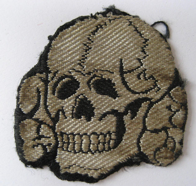 This is a very nice and nowadays rarely encountered Waffen-SS BeVo style cap skull in used and clearly cap-removed condition. This one is nicely executed in so-called 'BeVo' weave style and can easily be mounted on a Waffen-SS side-cap or even M43 cap. The skull - which is of the rarer larger-sized type - is greyish-/white coloured but is dirty and never cleaned. It shows some glue-remains on the back, caused by having been glued in an album once. A very nice skull that is not cheap but nowadays fully worth its money! These original skulls are almost impossible to find! This skull was previously also placed on the site: I deemed that it needed a new listing with a slightly reduced price!