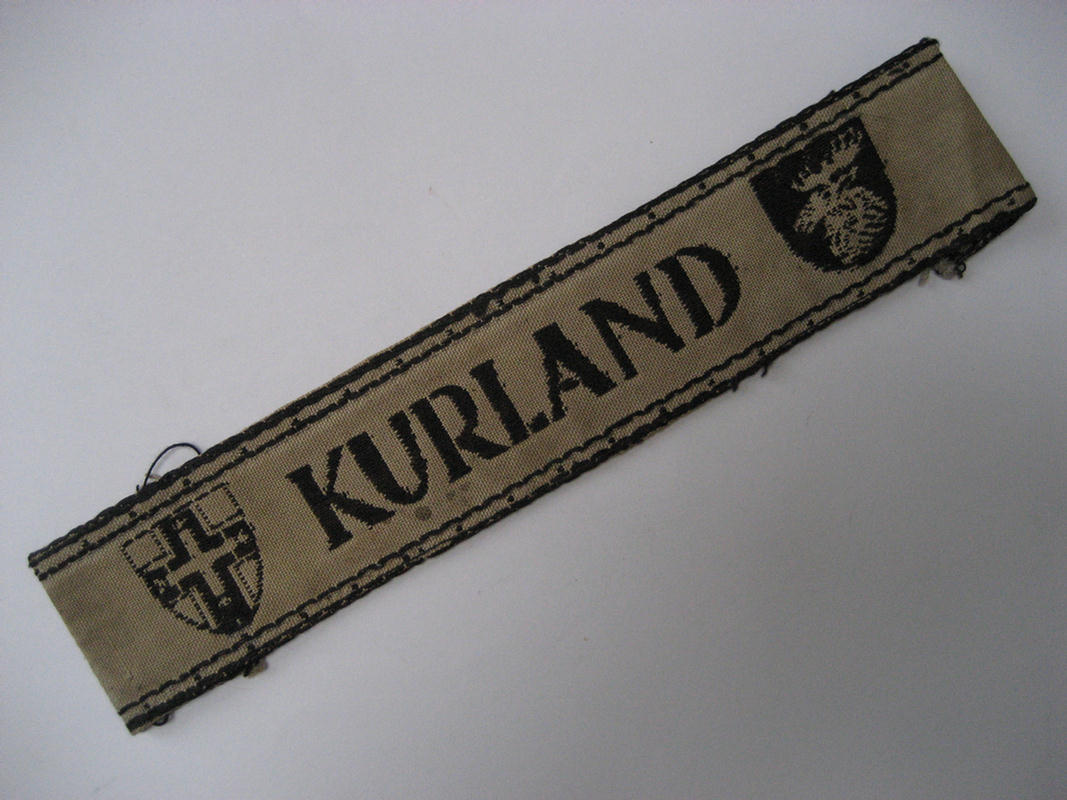 This is a text-book example of the 'Kurland' cuff-title. The armband is full-length (approx 24 cms.) and both ends show some normal fraying as is often the case with these bands). The band is in very nice, and only slightly used condition and has no flaws whatsoever (it shows some normal staining of having been worn on a tunic once). The cuff-title is executed in black cotton on a greyish (cotton) background. It should be stated that this is not a commemorative cuff-title (such as the 'Afrikakorps' cuff-title) but an official award that needed official recognition. A very nice and original example!