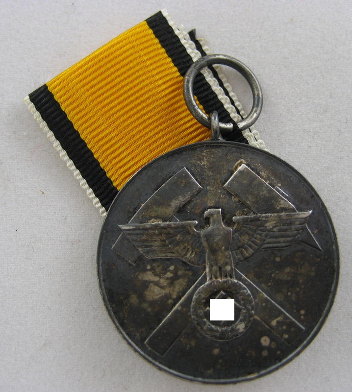 This is a rare example of the 'Grubenwehr Ehrenzeichen' (mine rescue honor medal) that comes with its original (17 cms. long) ribbon, in nice, albeit clearly used and most certainly issued condition. As certainly known are these medals often copied and most of the encountered specimens are not period. This example, however, originated from a stack of medals that was 'liberated' as a souvenir in 1945 by a US soldier and remained as such for years. It has great detail but has turned very dark (tarnished age-patina): it has however never been cleaned nor polished. The details on the piece are stunning! Naturally, do I provide a life-time garuantee on the originality of this piece! A nice opportunity to obtain one of the more difficult TR medals.