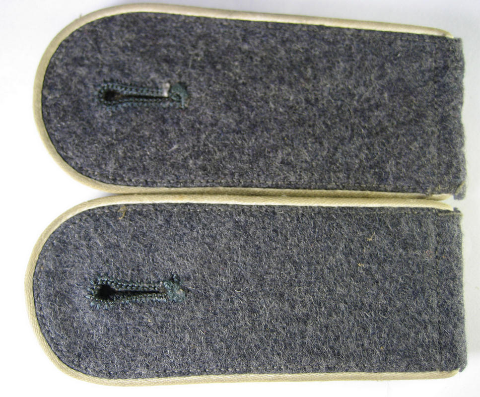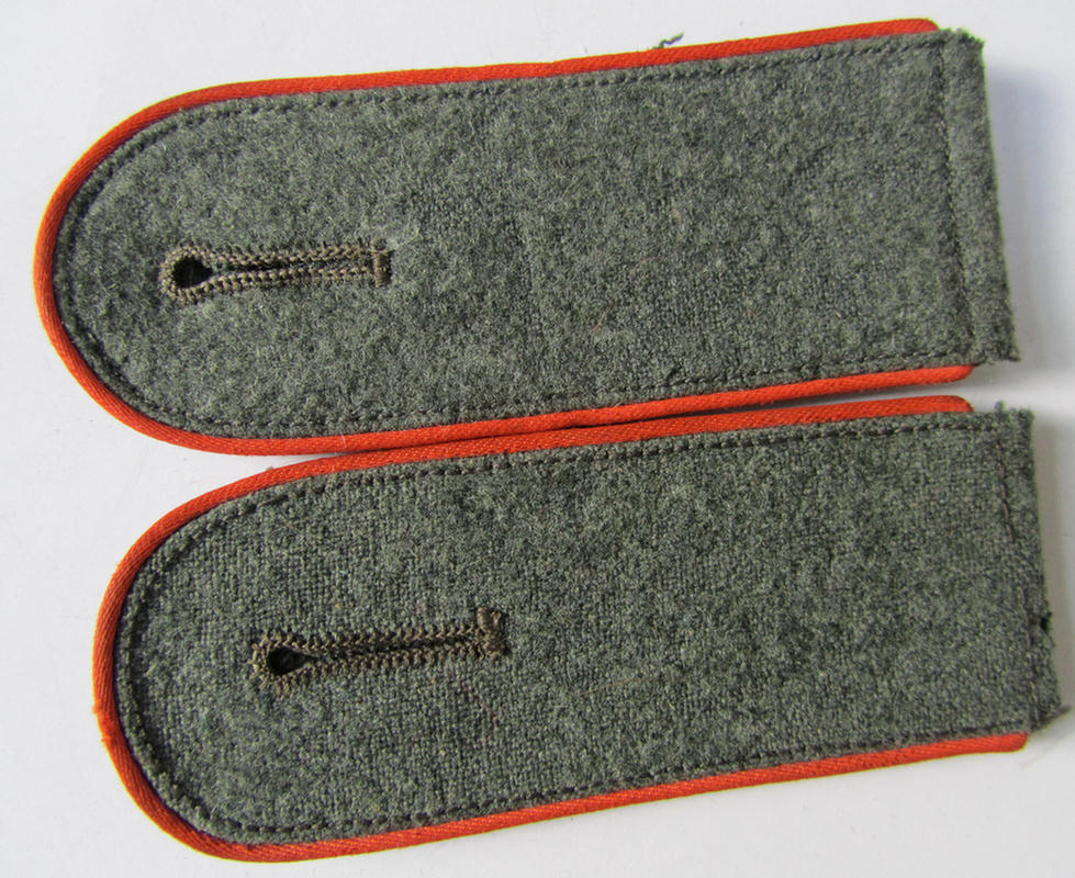 This is a very nice (and very rare!) pair of matching (IMO mid-war) WH (Heer) soldiers'-type shoulderboards, as intended for a soldier in a 'Feldgendarmerie' (= field-police) unit, in overall nice, albeit clearly used & worn condition. The boards have the neat bright-orange coloured 'silk-like'-type piping and show some regular stains from being simply dirty. They have never been cleaned and show some moth-damage (mainly on the back of one of the tongues). The boards were absolutely always together and were certainly worn as such. The pair - which is approximately 11,5 cms. in length - comes on its functional tongues. IMO a very nice and honest 'front-used' pair that would look nice if attached on a (M43) tunic or rubberised 'Kradmantel'. Moreover, is the orange 'Feldgendarmerie' branch-colour maybe the most difficult one to encounter. This is the first such pair I ever had on offer: I deem that the rather high asking price is absolutely appropiate for this very desirable pair!