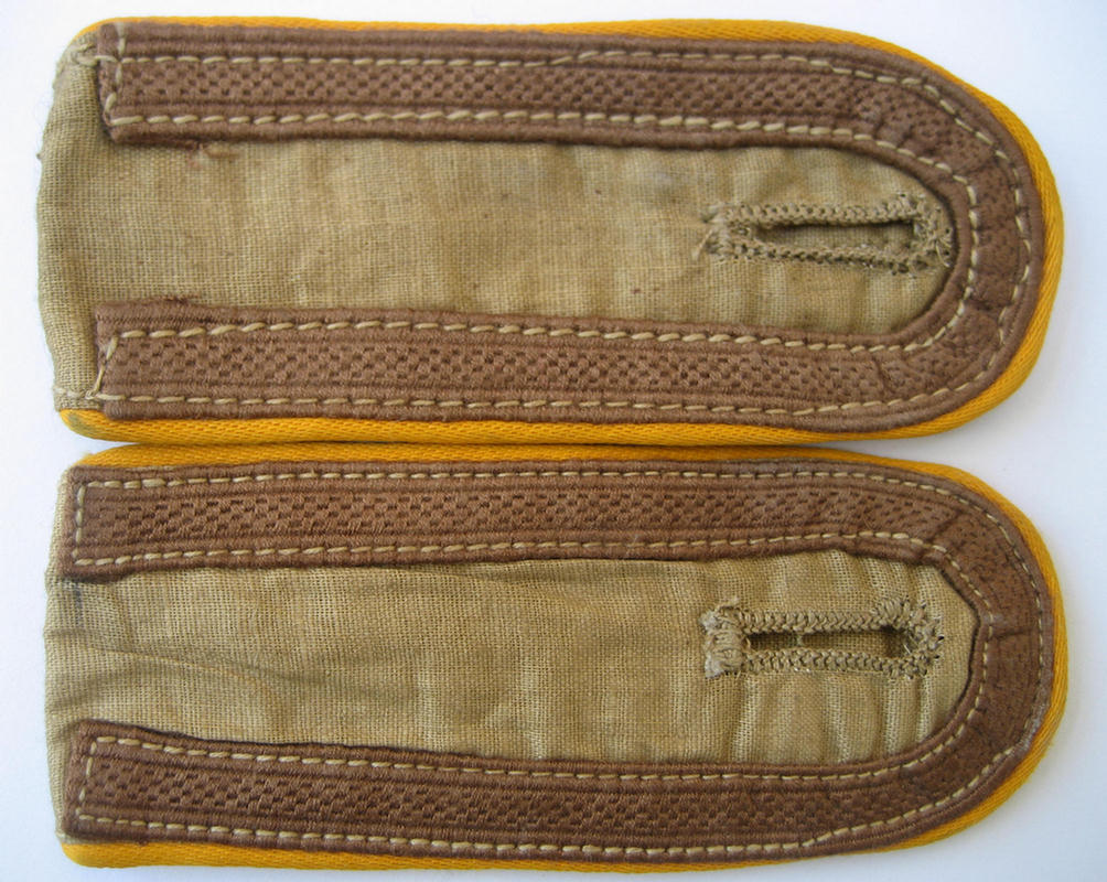 This is a very nice (and scarce!) set of fully matching WH Luftwaffe NCO 'Flieger/Fallschirmjäger', 'Unteroffizier'-type (NCO) tropical boards, as intended for the tropical shirt. The set has the neat 'silk-like' piping and is IMO in mint, unissued condition. The set would fit perfectly on a tropical LW shirt. LW tropical shoulderboards with the typical 'chocolate brown' NCO braid are considered very scarce! A nice and unusual pair!