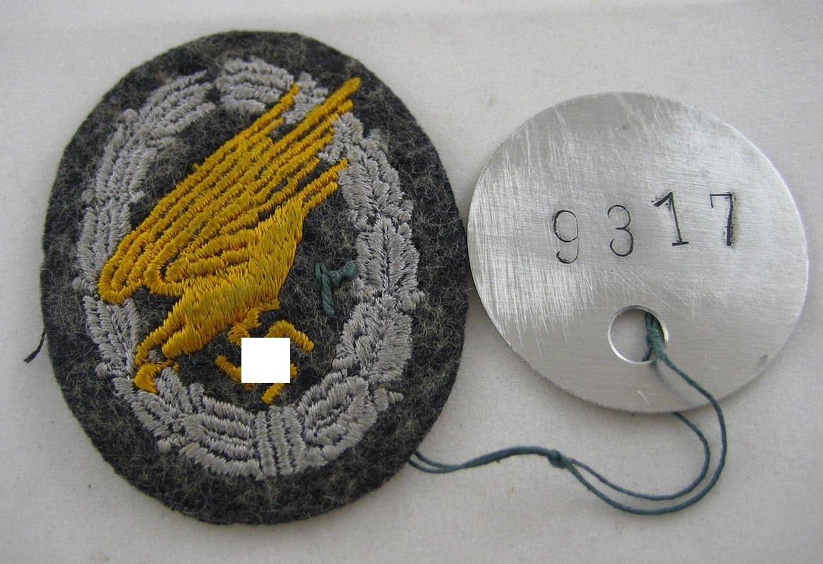This is a truly nice example of the scarce WH (Luftwaffe) paratroopers jumpbadge (or 'Fallschirmschützenabzeichen') in cloth ('padded' version!) that still has its original, aluminium 'Muster' tag attached, in mint, unissued condition. This one has great detail and is made thicker - by the producing company - to resemble the iron version. The piece is nicely 'backed' with thin black paper as usual: the middle part has been 'left open', thus showing the felt inner part. This example certainly originated from a period insignia-maker and has an aluminium, round-shaped 'tag' attached: this one is individually numbered: '9317' (most certainly being the makers' inventory code). These badges were preferred by the soldiers 'in the field' for obvious reasons. A nice, text-book example that cannot be upgraded: maybe the nicest such badge I ever had on offer. A great 'cheaper' alternative for its metal-counterparts!