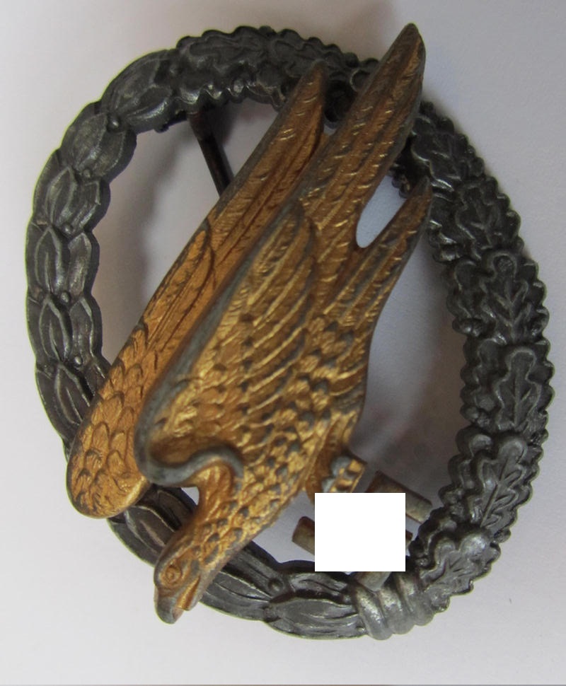This is a very nice, IMO mid-war, zinc (i.e.'Feinzink') version of a WH (Luftwaffe) 'Fallschirm- schützenabzeichen' (= paratrooper jump-badge), in nice albeit sligthly used condition. The badge has naturally a functional pin & catch construction and has IMO never been cleaned nor polished. Furthermore is most of its original golden finish still present: just the 'regular' higher areas show normal wear. This example is neatly maker-marked on the back with: 'B & N - L', signifying that was produced by the 'Berg u. Nolte' company based in Lüdenscheid. The badge shows great detail and still bears the dust from being kept for years. Simply a nice mm FJ-jump badge of unmistaken originality in slightly used condition!