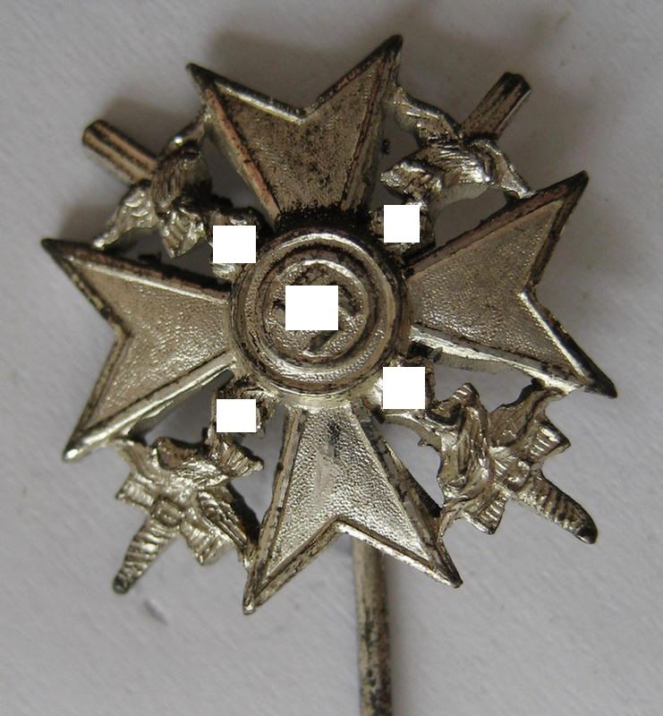 This is a nice - and very detailed! - example of the rare 16-mm. miniature of the 'Spanienkreuz in Silber mit Schwertern'. The lapel-pin, which comes on its full-length pin - is in clearly worn condition - but retains almost all its bright silver finish (which has just a bit tarnished over the years). The piece - which is uncleaned - is void of a makers'-mark or code. The detail is extremely nice for such a small item. A truly rare miniature that is not often offered for sale!