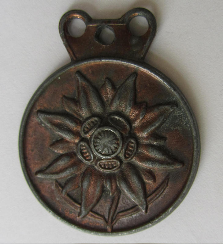 This is a nice 'Gebirgsjäger' related item: a scarcely encountered, semi-official medal: 'Eismeerfront - 1942-1943', in nice, albeit clearly used condition. The medal depicts an 'Edelweiss' flower on its front and comes without a cord or rope as found and/or worn: is a 'Feinzink' example that still shows a fair bit of its 'bronze-like' finish: it has really nice detail. I know that these desirable 'semi-official' medals are also copied: this is a genuine example that was never in a collection before and originates from a German flea-market. The term 'Eismeerfront' relates to one specific formation: the 'XIX Gebirgs Korps'. This 'Korps' had many units in its structure but the main elements were the '2' and '6' 'Geb.Div.' and the '210. Inf.Div.'. There is not much known about this 'medal' but it was most certainly a 'souvenir' piece that could be privately purchased by the soldiers active in this war-area. The piece shows some slight corrosion marks. In any case a nice and surely scarce 'Gebirgsjäger' related item!