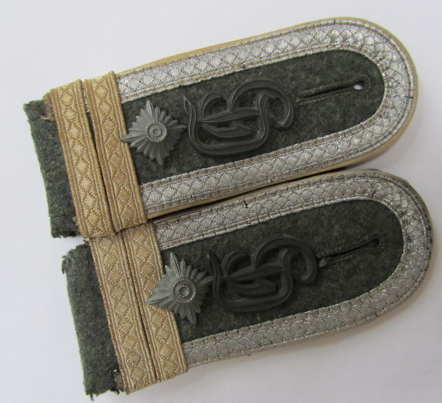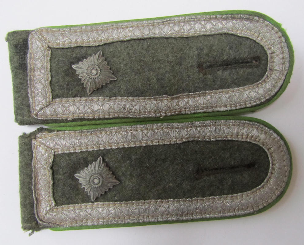 This is a very nice - and fully matching! - pair of WH (Heeres), mid- ie. late-war, NCO-type shoulderboards, having the bright-green ('silk-like') piping, as intended for a 'Feldwebel' (sergeant) in a 'Panzergrenadiere' (= rifle regiments) unit'. The boards - which measure 12 cms.in length - come on their original tongues and are in nice, text-book condition and show only fair wear and usage (some age and staining is visible). Both have a field-grey woolen deck, standard WH-type 'silverish' NCO-braid and two identical (regular-sized and zinc) pips, originally attached. It should be noted that 'Heeres' shoulderboard-pairs piped in this nice branch-colour are very hard to come by and regarded scarce. Simply a nice pair of truly used 'Panzergrenadiere' boards that can easily serve to complete a 'Heeres' tunic!