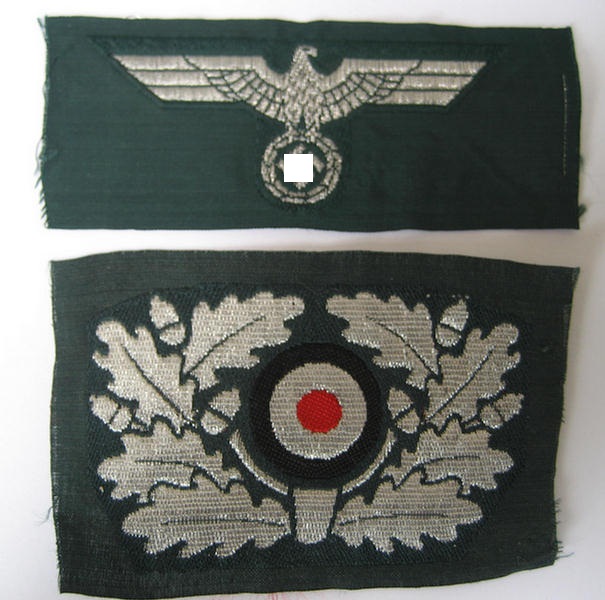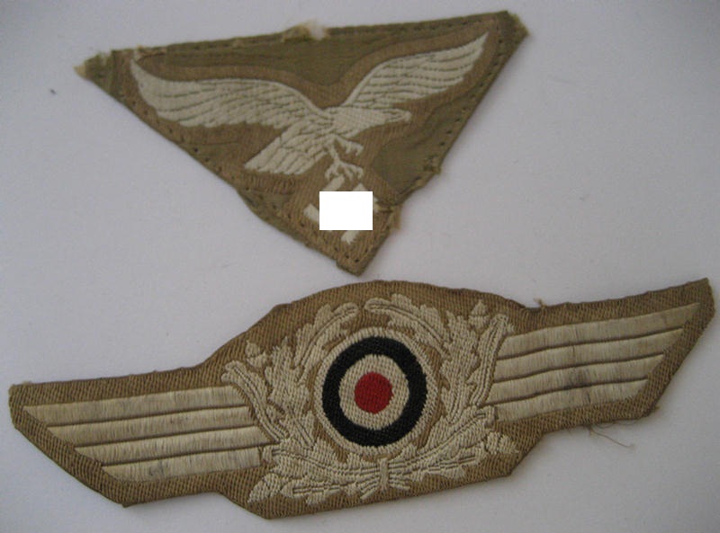 This is possibly one of the most rarest BeVo insignia-sets to find: a truly nice example of the WH (Luftwaffe) BeVo Tropical cap-eagle and cocarde, specifically designed for usage on the tropical LW so-called: 'Hermann Meyer' cap. Both pieces have been clearly worn and were neatly removed from a cap. This is the first such set I ever had on offer: I deem the high asking-price accordingly for this extremely rare set. Caps without insginia are sometimes offered for sale: the specific inisignia are as far as I know never offered for sale. A very rare and desirable set!